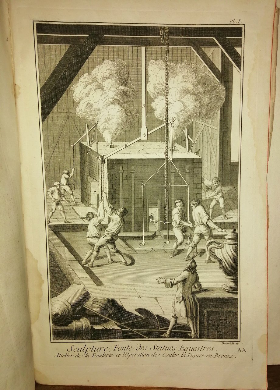 In-folio (39,5 cm) 4 V c. (di tav.) II c. (di tav.) III c. (di tav.) V c. (di tav.) V c. (di tav.) IV c. (di tav.) Cartoncino con carta marmorizzata. Tavole delineate da Bourgeois ed incise da Benard. Proviene da Encyclopédie ou Dictionnaire raisonné des sciences, des arts et des métiers, opera enciclopedica in 35 voll., di cui 11 di tavole, pubblicata a Parigi tra il 1751 e il 1772. Diretta da D. Diderot, intendeva esporre i progressi compiuti dall'umanità in tutti i campi, con particolare riguardo alla tecnica. Le voci furono scritte da letterati, specialisti, medici e ingegneri, tra cui J.-B. D'Alembert, Voltaire, C. Montesquieu, J.-J. Rousseau, E. Condillac. "Recueil de Planches, sur les sciences, lse arts liberaux, et les arts mechaniques, avec leur explication. Septieme livraison, ou huitieme volume. 254 planches. A Paris, chez Briasson, rue Saint Jacques, à la Science, 1771". French language. Lingua francese