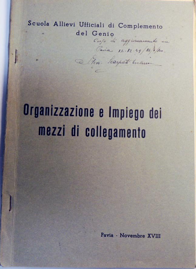 Scuola Allievi Ufficiali di Complemento del Genio, Appunti sulle lezioni di organizzazione e impiego dei mezzi di collegamento, s.n, Pavia s.d. (1939?), pp. 81, ill. b.n., cm 25. Firma d’appartenenza, luogo e data alla copertina. Intonso.