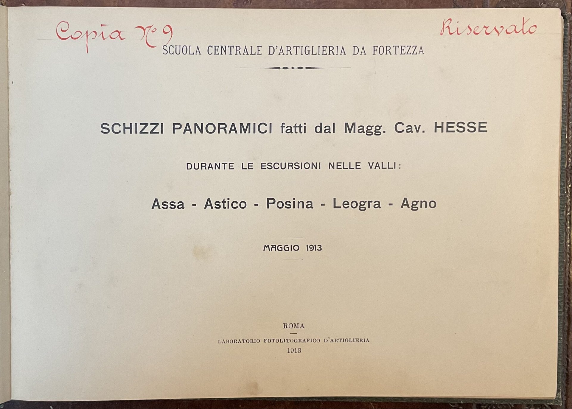 Scuola Centrale d�Artiglieria da Fortezza. Schizzi panoramici fatti dal Magg. Cav. Hesse, durante le escursioni nelle valli Assa - Astico - Posina - Leogra - Agno. Maggio 1913