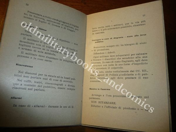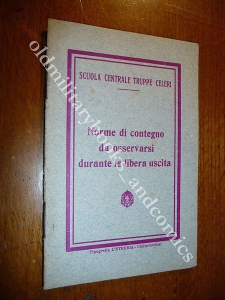 DESCRIZIONE: Tipografia L'ETRURIA Civitavecchia anni '30 del secolo scorso pp. 12 in 16°. Tutto quanto deve conoscere il militare che si reca in libera uscita, saluto, contegno per la strada, riservatezza etc. etc. Indice completo in foto. CONDIZIONI: Ottime, bianco non utilizzato, tracce di fox all'interno. PESO / WEIGHT: 10 gr. without package