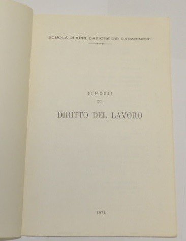 Scuola di applicazione dei carabinieri, Sinossi di diritto del lavoro (Corso Tecnico Professionale), s.n., s.l. 1974, pp. 106, cm 24, br. ed. Sigla di appartenenza alla prima pagina, tracce d'uso alla brossura, sporadici segnetti e sottolineature a lapis, ma assolutamente irrilevanti, per il resto buono.