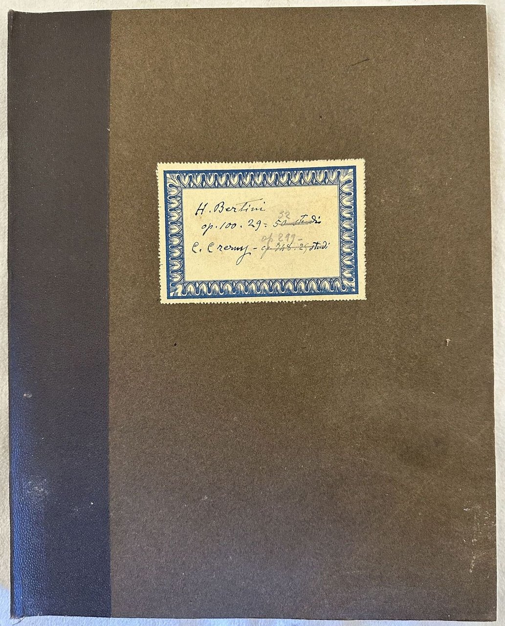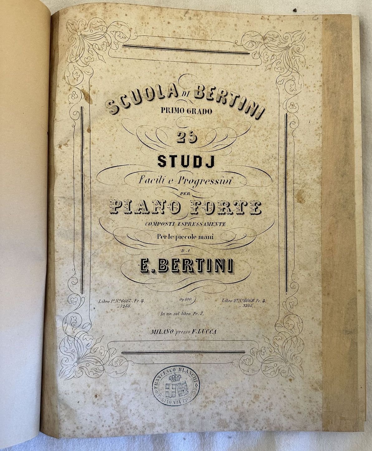 Raccolta di due studi per pianoforte del 1870 circa dall'opera 100 e 29 di Henri Bertini (1798-1876) compositore e pianista francese. Le prime due raccolte sono il libro primo e secondo dall'opera 100 della scuola di primo grado. L'ultimo di secondo grado sono 25 studi tratti dall'opera 29.<BR> In discrete condizioni. Copertina in tela con titolo manoscritto in buone condizioni con lievi usure marginali. Legatura in buone condizioni. All'interno le pagine si presenTwo studies for piano of 1870's from the work 100 and 29 by Henri Bertini (1798-1876) french pianist and composer. The first two collections are the first and second books form the work 100 of the school of first degree. The last one of second degree are 25 studies for the work 29. In fair conditions. Cloth cover with handwritten title in good conditions lightly worn in the extremities. Binding in good conditions. Inside pages are in fair conditions with foxing and reinforcements in the esges. In folio. Dim. 31,5x25 cm. Pp. 37+35.tano in discrete condizioni con fioriture e rinforzi marginali. In folio. Dim. 31,5x25 cm. Pp. 37+35.