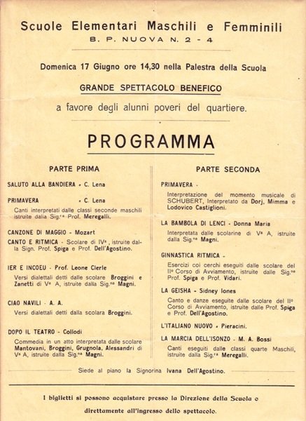 Scuole Elementari Maschili e Femminili. B. P. Nuova n. 2, 4. Domenica 17 Giugno grande spettacolo benefico. Programma.