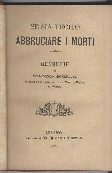 Se sia lecito abbruciare i morti - Ricerche di Giacomo Scurati Sacerdote del Seminario delle Missioni Estere di Milano