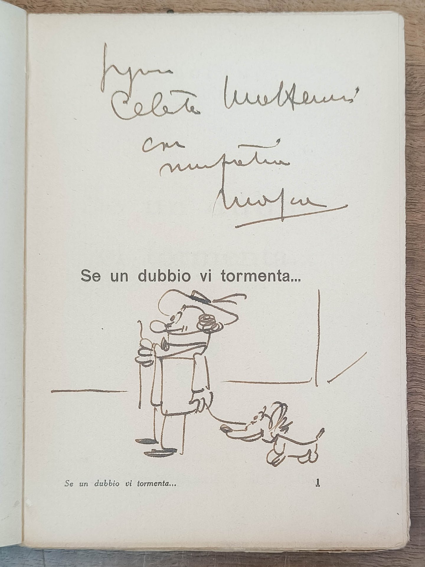 Se un dubbio vi tormenta, Roma, M. Carrara & C. di L. Bellini, 1934. Prima edizione. Cm 19. Pp. 159. Brossura editoriale illustrata. Collana: Gli umoristi del Marc'Aurelio. Dedica autografa dell'autore all'occhiello con disegno caricaturale dell'autore.