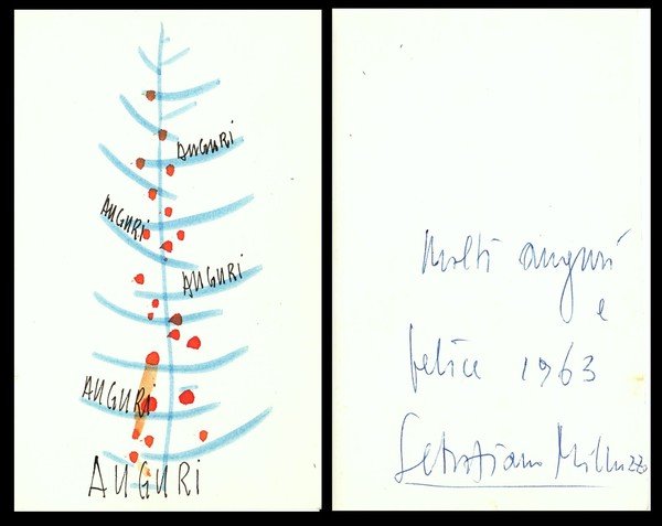 Sebastiano Milluzzo. Disegno originale all'acquerello su biglietto di auguri autografo.