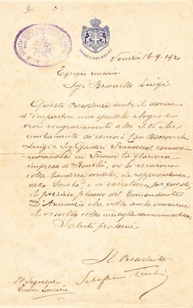 lettera manoscritta e firmata di Sebastiano Tecchio di 1 facciata datata Venezia, 16 Agosto 1920 su carta intestata "Senato del Regno"; si segnala uno strappetto al margine destro; discreto es.