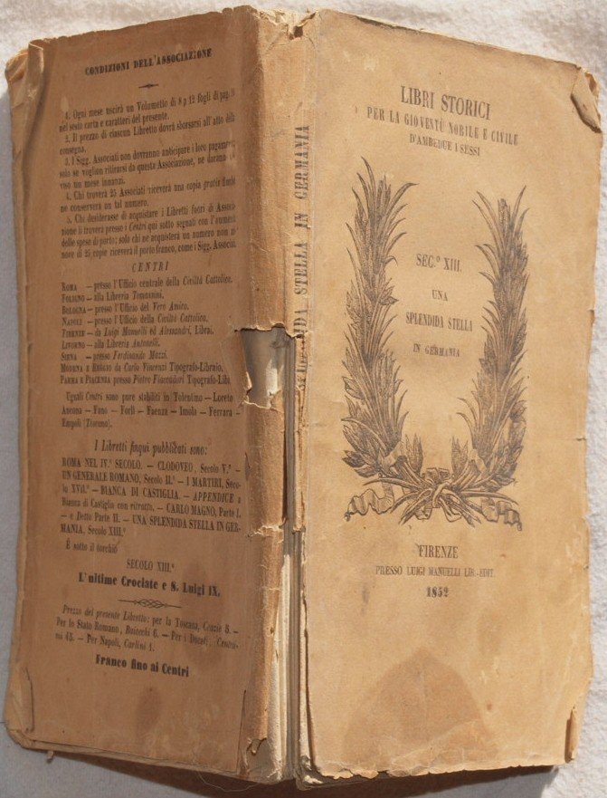 In 16. Dim. 16,5x11 cm. Pp. 120. Edizione del 1852 di questo raro romanzo della serie "Libri storici per la gioventù nobile e civile d'ambedue i sessi". I dati editoriali vengono riportati in copertina, editorialmente non venne stampato il frontespizio. Il romanzo è in un volume ed è completo. Brossura editoriale originale. In discrete condizioni Brossura editoriale in discrete condizioni generali con usure e parti mancanti ai margini e dorso; copertina quasi del tutto staccata dalla copertina. Legatura quasi assente. All'interno le pagine si presentano in discrete condizioni con fioriture. Edition of 1852 of this scarce novel of the series "Libri storici per la gioventù nobile e civile d'ambedue i sessi" The editorial data are written in the cover, the title page editorially was not printed. The novel is in one volume and it is complete. Editorial original cover. In fair conditions. Editorial cover in fair general conditions with wearings and missing parts in the edges and spine; cover almost totally detached from the cover. Binding is almost missing. Inside pages are in fair conditions with foxings.
