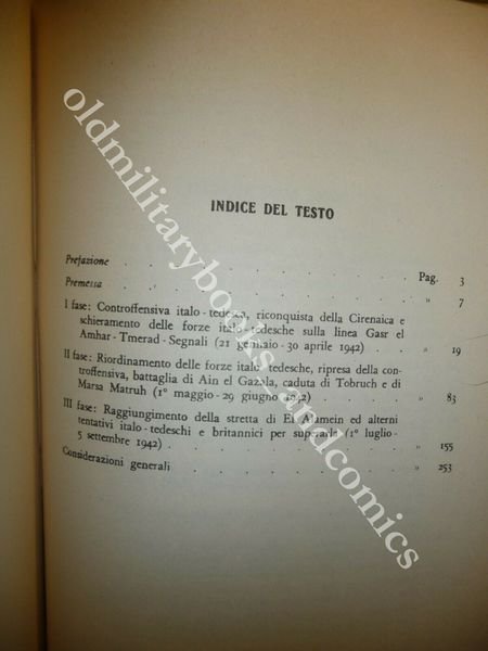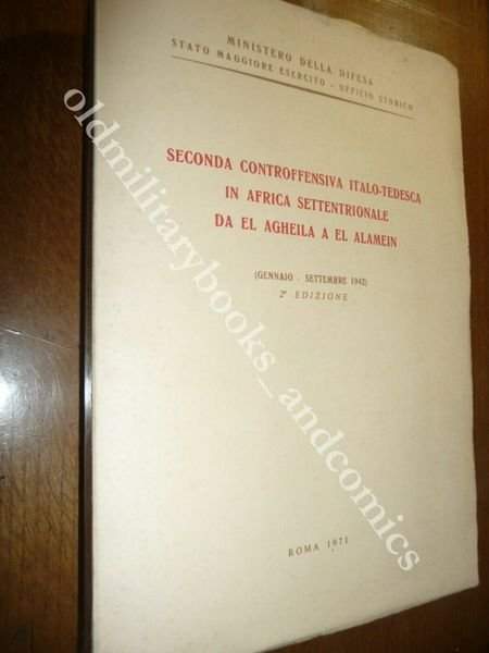 TITOLO: SECONDA CONTROFFENSIVA ITALO-TEDESCA IN AFRICA SETTENTRIONALE DA EL AGHEILA A EL ALAMEIN (GENNAIO - SETTEMBRE 1942) DESCRIZIONE: Ministero della Difesa Stato Maggiore Esercito Ufficio Storico Roma 1971 II^ Ed., br. ed., pp. 432 26 carte rip. in tasca a fine vol. in 8°. Volume dello SME su uno dei periodi piu' importanti e cruciali della campagna dell'Africa Settentrionale. CONDIZIONI: Ottime/Perfette, lievi abrasioni al retro di cop. PESO / WEIGHT: 1008 gr. without package