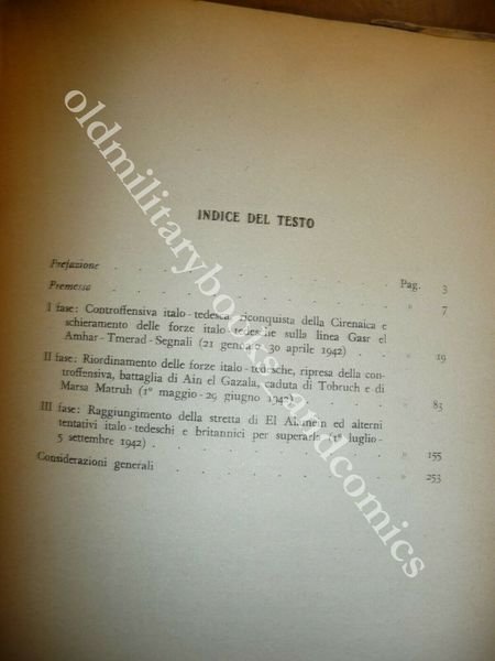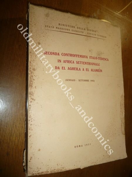TITOLO: SECONDA CONTROFFENSIVA ITALO-TEDESCA IN AFRICA SETTENTRIONALE DA EL AGHEILA A EL ALAMEIN (GENNAIO - SETTEMBRE 1942) DESCRIZIONE: Ministero della Difesa Stato Maggiore Esercito Ufficio Storico Roma 1951, pp. 432 br. ed., 26 carte rip. in tasca a fine vol. in 8°. Volume dello SME su uno dei periodi piu' importanti e cruciali della campagna dell'Africa Settentrionale. CONDIZIONI: Discrete/Buone vol. interessato da fox in cop. ed a fine vol. dove c'è la tasca con le carte. PESO / WEIGHT: 1008 gr. without package