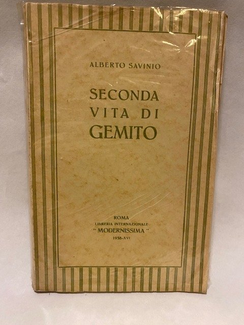 Bella brossura editoriale giallo verdina, acetato leggero di protezione, copia ottima. Prima edizione di questo raro libro di Savinio con 4 tavole illustrate fuori testo. Tiratura 500 esemplari numerati (ns.92). Sc. G.