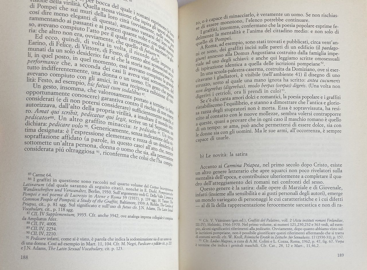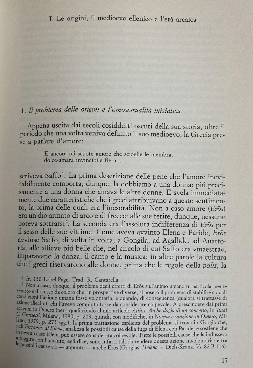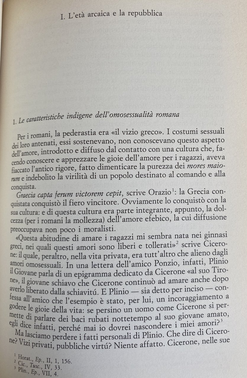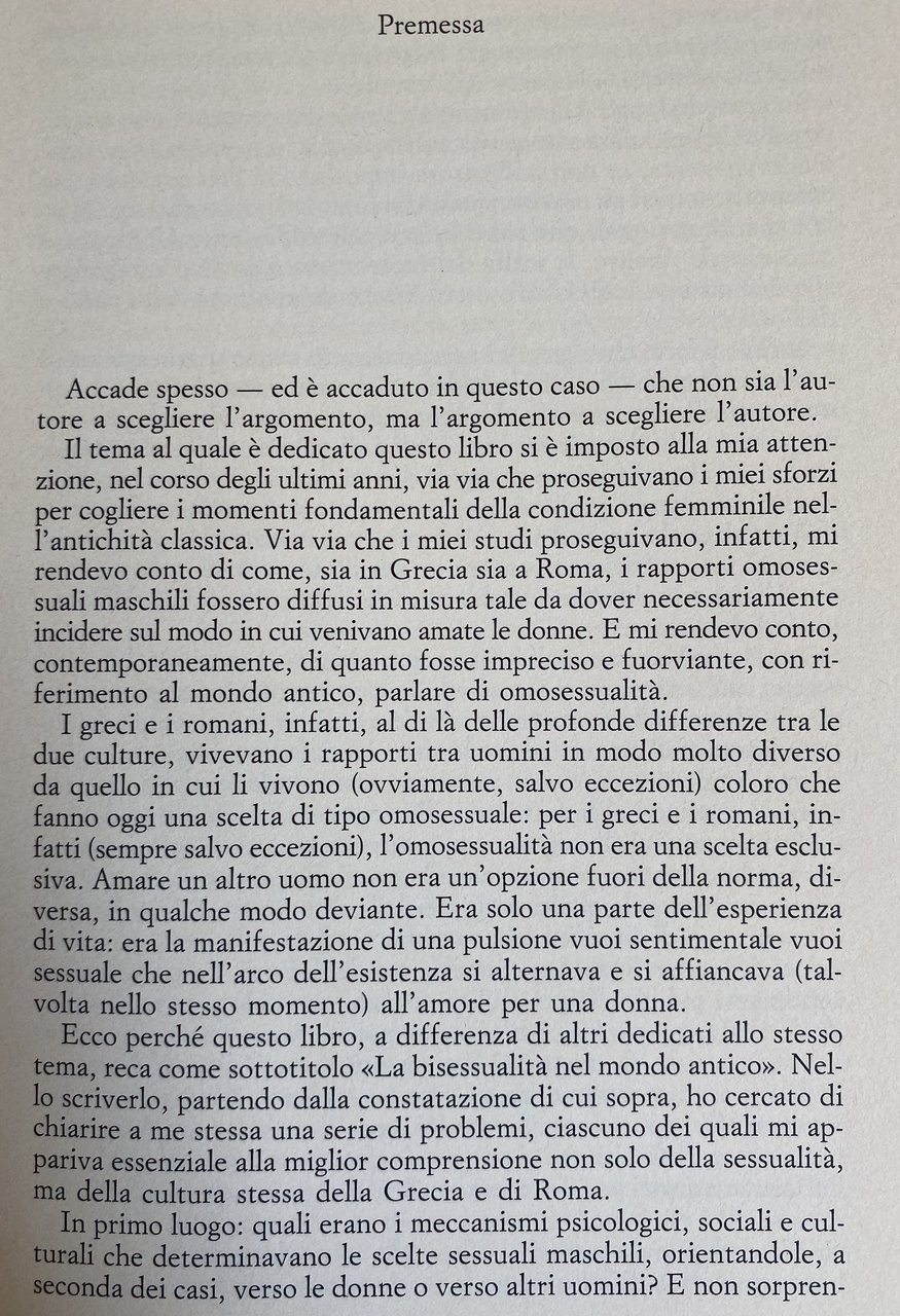 Via via che i miei studi proseguivano, mi rendevo conto di come, sia in Grecia sia a Roma, i rapporti omosessuali maschili fossero diffusi in misura tale da dover necessariamente incidere sul modo in cui venivano amate le donne. E mi rendevo conto, contemporaneamente, di quanto fosse impreciso e fuorviante, con riferimento al mondo antico, parlare di omosessualità. I greci e i romani, infatti, al di là delle profonde differenze tra le due culture, vivevano i rapporti tra uomini in modo molto diverso da quello in cui li vivono coloro che fanno oggi una scelta di tipo omosessuale: per i greci e i romani, infatti (salvo eccezioni), l'omosessualità non era una scelta esclusiva. Amare un altro uomo non era un'opzione fuori della norma, diversa, in qualche modo deviante. Era solo una parte dell'esperienza di vita; era la manifestazione di una pulsione vuoi sentimentale vuoi sessuale che nell'arco dell'esistenza si alternava e si affiancava all'amore per una donna. Quali erano i meccanismi psicologici, sociali e culturali che determinavano le scelte sessuali maschili, orientandole, a seconda dei casi, verso le donne o verso altri uomini? La possibilità di avere esperienze sia eterosessuali sia omosessuali, era consentita (quantomeno sul piano teorico) solamente agli uomini. L'opzione omosessuale era pienamente e assolutamente libera, o era sottoposta a delle regole, e pertanto in qualche modo vincolata, se non addirittura imposta? Più precisamente, era consentita a tutti gli uomini, quale che fosse la loro condizione socia le e giuridica e quale che fosse la loro età? All'interno del rapporto omosessuale, inoltre, la scelta del ruolo attivo o passivo era lasciata alle inclinazioni individuali, o era invece determinata dallo dall'età? Infine: il fatto che i greci e i romani dessero ampio spazio agli amori omosessuali maschili, considerandoli un'alternativa assolutamente normale a quelli eterosessuali, che conseguenza aveva sui loro giudizi di valore, sul loro costume sul loro diritto? Se assunta a regola di vita, la bisessualità è esperienza che può segnare profondamente una cultura, contribuendo in modo tutt'altro che secondario a determinarne i caratteri: e per convincersene sarà sufficiente pensare per limitarci a un solo esempi, al celebre e dibattuto problema della funzione sociale dell'omosessualità ateniese.