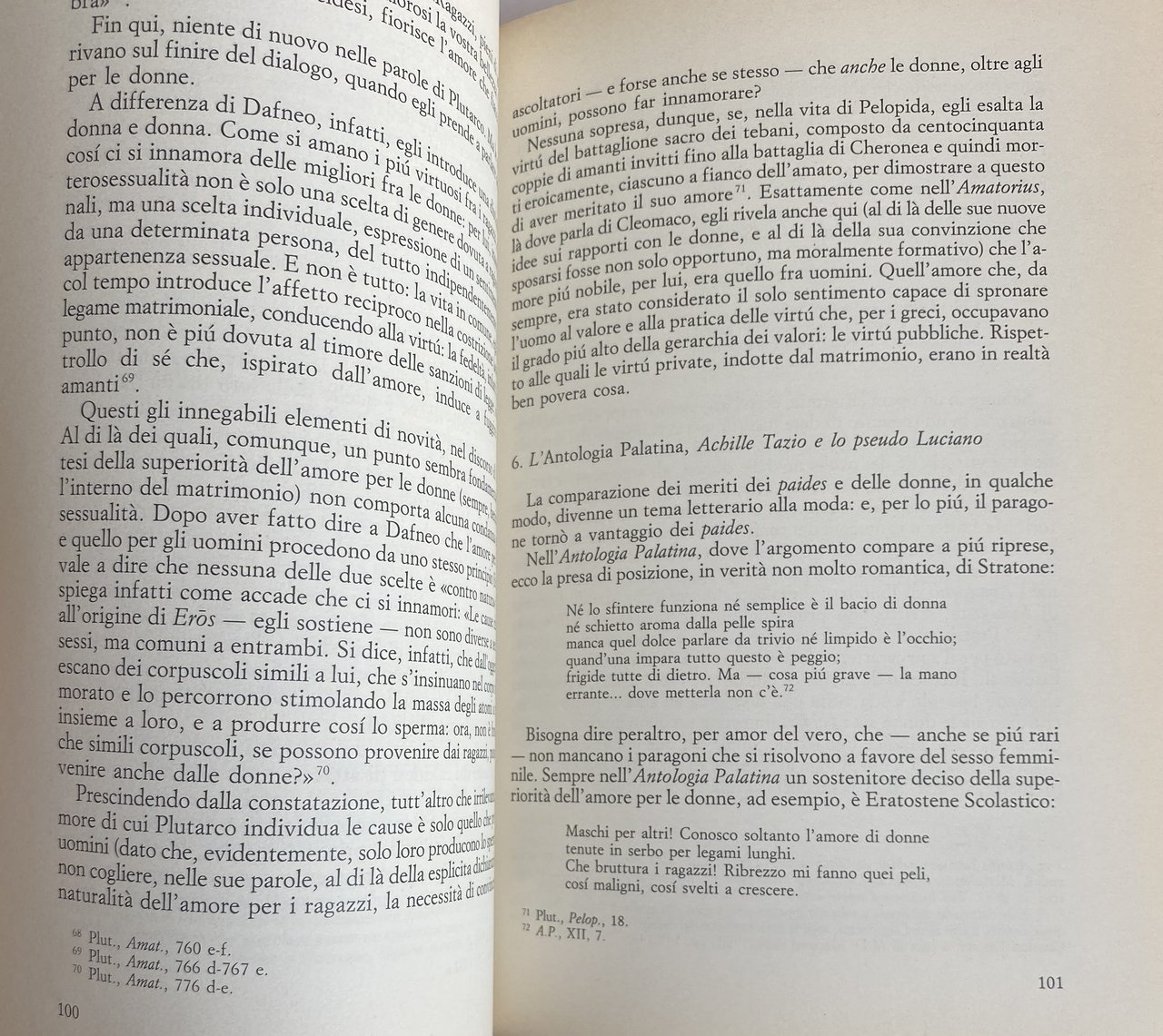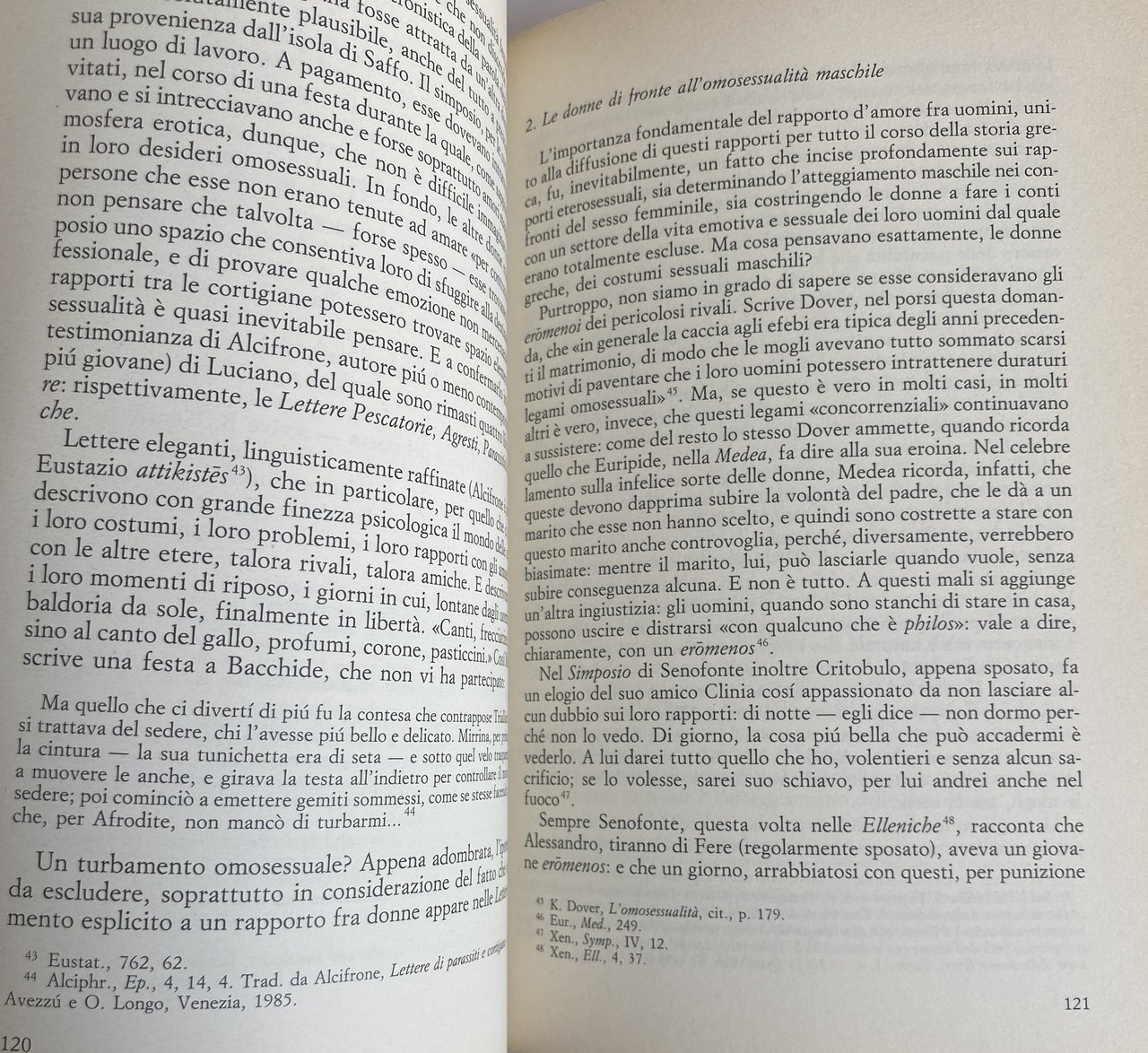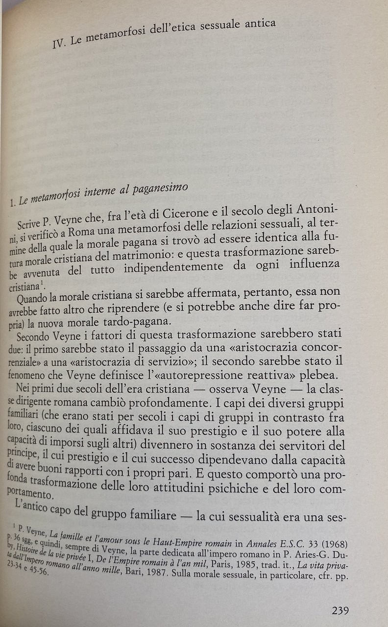 Via via che i miei studi proseguivano, mi rendevo conto di come, sia in Grecia sia a Roma, i rapporti omosessuali maschili fossero diffusi in misura tale da dover necessariamente incidere sul modo in cui venivano amate le donne. E mi rendevo conto, contemporaneamente, di quanto fosse impreciso e fuorviante, con riferimento al mondo antico, parlare di omosessualità. I greci e i romani, infatti, al di là delle profonde differenze tra le due culture, vivevano i rapporti tra uomini in modo molto diverso da quello in cui li vivono coloro che fanno oggi una scelta di tipo omosessuale: per i greci e i romani, infatti (salvo eccezioni), l'omosessualità non era una scelta esclusiva. Amare un altro uomo non era un'opzione fuori della norma, diversa, in qualche modo deviante. Era solo una parte dell'esperienza di vita; era la manifestazione di una pulsione vuoi sentimentale vuoi sessuale che nell'arco dell'esistenza si alternava e si affiancava all'amore per una donna. Quali erano i meccanismi psicologici, sociali e culturali che determinavano le scelte sessuali maschili, orientandole, a seconda dei casi, verso le donne o verso altri uomini? La possibilità di avere esperienze sia eterosessuali sia omosessuali, era consentita (quantomeno sul piano teorico) solamente agli uomini. L'opzione omosessuale era pienamente e assolutamente libera, o era sottoposta a delle regole, e pertanto in qualche modo vincolata, se non addirittura imposta? Più precisamente, era consentita a tutti gli uomini, quale che fosse la loro condizione socia le e giuridica e quale che fosse la loro età? All'interno del rapporto omosessuale, inoltre, la scelta del ruolo attivo o passivo era lasciata alle inclinazioni individuali, o era invece determinata dallo dall'età? Infine: il fatto che i greci e i romani dessero ampio spazio agli amori omosessuali maschili, considerandoli un'alternativa assolutamente normale a quelli eterosessuali, che conseguenza aveva sui loro giudizi di valore, sul loro costume sul loro diritto? Se assunta a regola di vita, la bisessualità è esperienza che può segnare profondamente una cultura, contribuendo in modo tutt'altro che secondario a determinarne i caratteri: e per convincersene sarà sufficiente pensare per limitarci a un solo esempi, al celebre e dibattuto problema della funzione sociale dell'omosessualità ateniese.