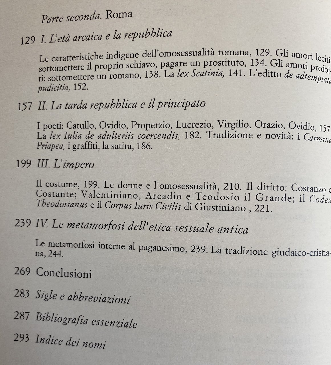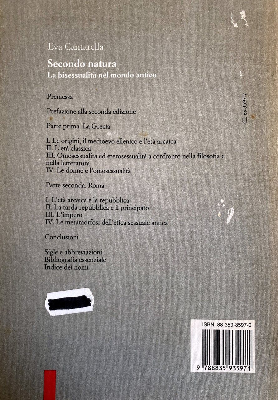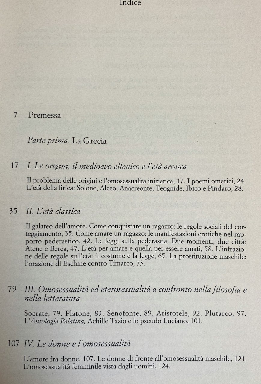 Soggetti: Storia sociale di genere Grecia Medioevo ellenico Età arcaica Origini Omosessualità iniziatica Poemi omerici Lirica Solone Alceo Anacreonte Teognide Ibico Pindaro Classica Uomini Donne Galateo Sessualità Relazioni sessuali Conquistare un ragazzo Regole sociali Corteggiamento Amore saffico Amare Eros Erotismo Manifestazioni erotiche Giovani Pederastia Subordinazione Rapporto pederastico Patriarcato Matriarcato Leggi Città Poleis Atene Berea Usi e costumi Costume Prostituzione maschile Forazione Eschine Timarco Bisessualità Eterosessualità Filosofia Socrate Platone Senofonte Aristotele Plutarco Antologia Palatina Achille Tazio Pseudo Luciano Femminile Impero romano Roma Repubblica Amori leciti Sottomissione Schiavitù Schiavo Liberto Prostituto Proibiti Lex Scatinia Editto Adtemptats pudicitia Principato Poeti Catullo Ovidio Properzio Lucrezio Virgilio Orazio Iulia de adulteriis coercendis Carmina Priapea Graffiti Satira Diritto Costanzo Costante Valentiniano Arcadio Teodosio Codex Theodosianus Corpus Iuris Civilis Giustiniano Metamorfosi Etica sessuale antica Paganesimo Tradizione giudaico-cristiana Cristianesimo Bibliografia Saggi Libri rari fuori catalogo Studi culturali Collezionismo Selon la nature l'usage et la loi La bisexualité dans le monde antique Según natura Bisexualidad en el mundo antiguo Partner passivo Greci Romani Dinamiche Letteratura filosofica Adolescenti Stupro Adulti Alcmane Amanti Aristofane Callicratida Caricle Comportamento Condanna Giuvenzio Lesbia Marziale Matrimonio Mishnah Moglie Morale Paides Pais Passività Politica Pueri Ragazzi Rapporti Richlin Saffo Simposio Sodomiti Sodomizzazione Sposa Teocrito Tibullo Tribadi Veyne Virilità Adtemptata Tradimento Adulterio Società Dover Elena Simboli fallici Pompei Pareti Domus Iscrizioni pompeiane Néraudau Scantius Trasgressione Valerio Massimo Vidal-Naquet Tertulliano Wilamowitz Vernant Vegetti Vetta Mollendorff Scroggs Sergent Sullivan Mommsen Marrou Guthrie Horowitz Hallet Kelsen Fluck Foucault Giovenale Epicuro Dalla Bailey Christius Adams Augusto Riferimento Manfredini Brisson Mitologia Social history Gender Greece Hellenic Middle Ages Archaic Age Origins Initiatory homosexuality Homeric poems Lyric Solon Alcaeus Anacreon Theognis Ibycus Pindar Classical Men Women Etiquette Sexuality Relations Conquering Rules Courtship Sapphic love Loving Eroticism Erotic manifestations Youth Pederasty Subordination Pederastic relationship Patriarchy Matriarchy Laws City Athens Customs and traditions Male prostitution Perforation Aeschines Timarchus Bisexuality Heterosexuality Philosophy Socrates Plato Xenophon Aristotle Plutarch Palatine Anthology Achilles Tatius Pseudo-Lucian Feminine Roman Empire Rome Republic Permissible loves Submission Slavery Slave Freedman Prostitute Forbidden Edict Poets Catullus Ovid Propertius Lucretius Virgil Horace Satire Law Constantius Constantus Valentinian Arcadius Theodosius Justinian Metamorphosis Ancient Ethics Paganism Tradition Judeo-Christian Christianity Bibliography Essays Rare books out of print Cultural studies Collecting Passive Greeks Romans Dynamics Philosophical literature Adolescents Rape Adults Alcman Lovers Aristophanes Callicratidas Charicles Behavior Condemnation Juventius Martial Marriage Wife Passivity Politics Boys Relationships Sappho Symposium Sodomites Sodomization Theocritus Tibullus Tribades Virility Aged Betrayal Adultery Society Helen Phallic symbols Pompeii Walls Pompeian inscriptions Transgression Tertullian Juvenal Epicurus Augustus Reference Mythology