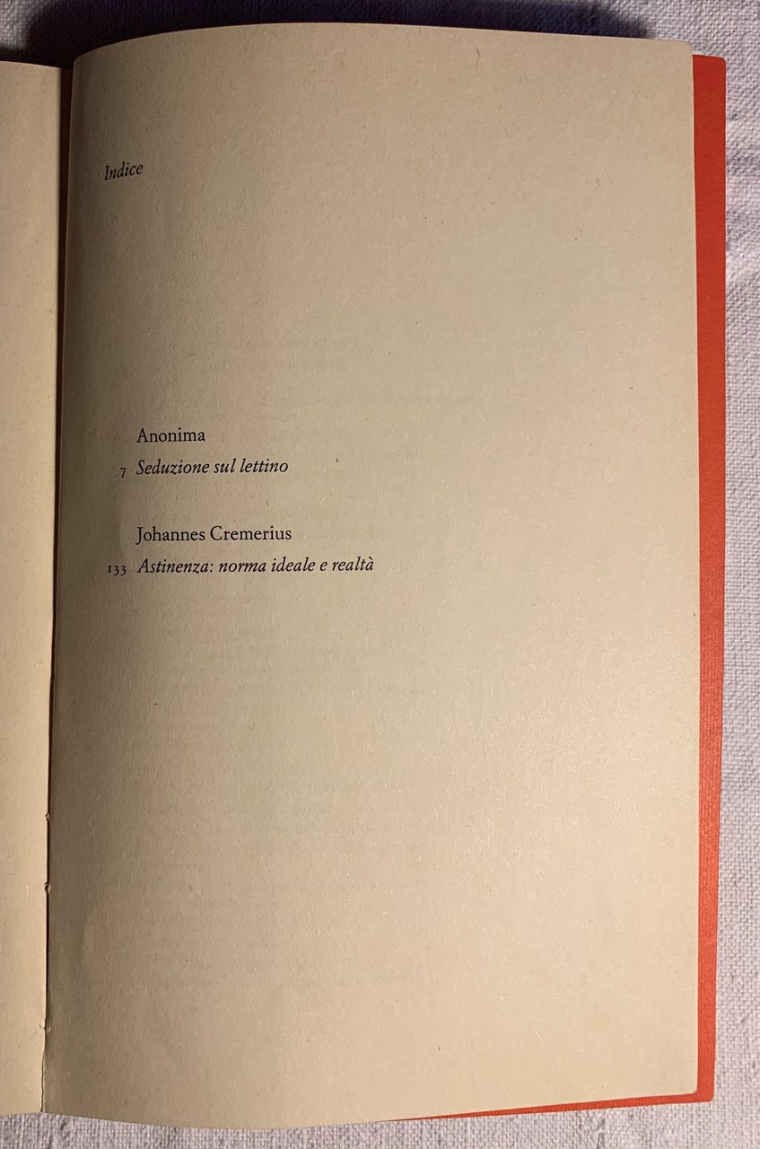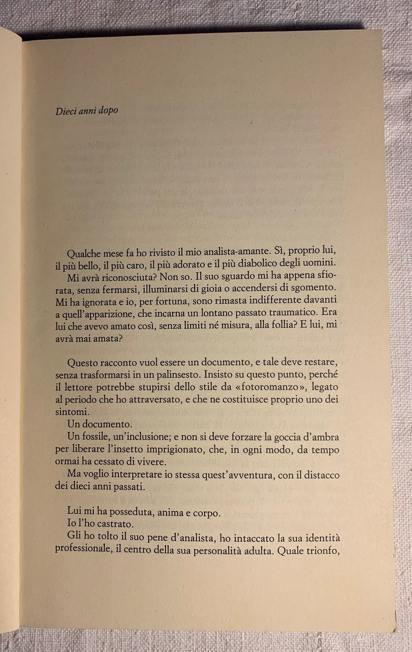I ed. italiana: aprile 1990 (ed. originale: Verführung der Couch. Eine Niederschrift , mit einem Beitrag von Johannes Cremerius, Abstinenz - Maxime und Realität, Freiburg i. Br., Traute Hensch Kore Verlag 1988). Traduzione di Maria Anna Massimello (La traduzione di Verführung der Couch è stata condotta sull'edizione francese, Séduction sur le divan ou le malentendu amoureux, Paris, Edition La Découverte 1989). Collana Varianti. VIII/ 154/ bross./ sovraccoperta in carta ruvida (Schema della copertina di Pierluigi Cerri). Stato buono (usura della sovraccoperta - sovraccoperta, copertina e pagine brunite - ex libris incollato a p. 1, pagina non stampata - sottolineature, segni e qualche appunto a margine nel saggio del Cremerius).