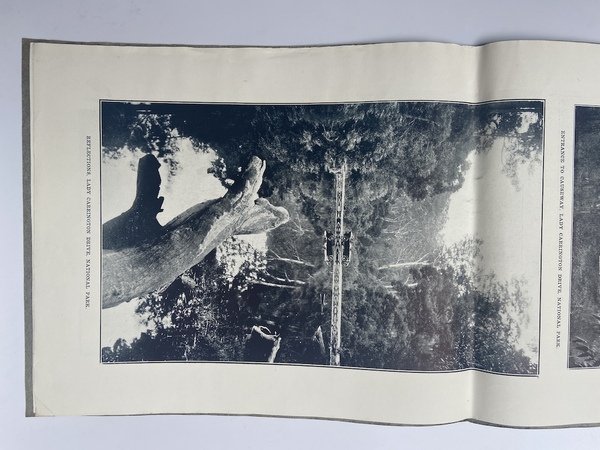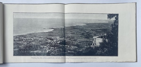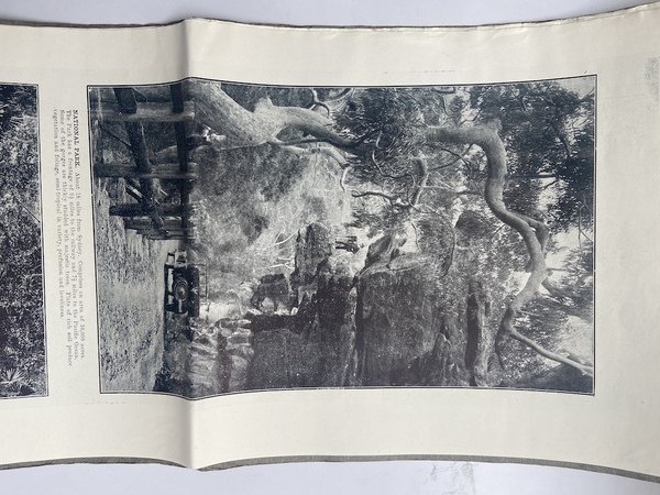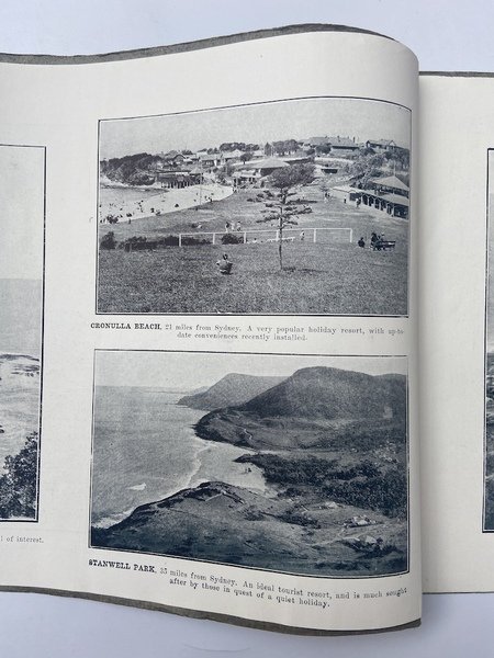 Fascicolo spillato in brossura, formato oblungo cm52x22, copertina cartoncino grigio con illustrazione di gusto deco sul piatto anteriore, 24 pagine non numerate (12 fogli patinati stampati fronte e retro) interamente illustrate in nero, con didascalie. Fascicolo turistico dedicato all’Illawarra, nella costa meridionale australiana, dal fotografo Harry Phillips, attivo a Katoomba e autore di numerose immagini delle Blue Mountains e zone limitrofe. Questo fascicolo, particolarmente attento al turismo in automobile con numerose immagini di vetture alle prese con le sinuose strade locali, presenta fotografie delle località Bulli Pass, Wollongong, Kiama, Cronulla Beach, Stanwell Park, Thirroul, Lady Carrington Drive, Como Bridge, Austinmer, monte Kiera. Travel catalog with photographs by Harry Phillips, depicting coastal views and roads in the Illawarra region. Folded in half, some wear to the borders, and last page is detached from the first 11 leaves, while being still attached to back cover. Oxidation on metal clips.