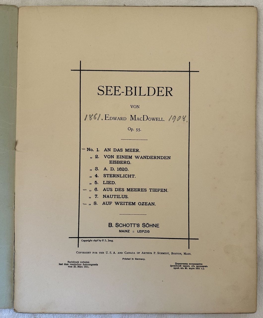 Edizione del 1911 della melodia per pianoforte dell'opera "See-bilder" del compositore americano Edward MacDowell (1860-1908). Illustrazione in copertina. In buone condizioni. Copertina editoriale in buone condizioni con lievi usure marginali. Legatura in buone condizioni. Pagine in buone condizioni con rare fioriture. In 4. cm. 30,5x24,5. Pp. 38. Edition of 1911 of the melody for piano of the opera "See-bilder" by the american composer Edward MacDowell (1860-1908). Illustration in the cover. In good conditions. Editorial cover in good conditions lightly worn in the extremities. Binding in good conditions. Pages in good conditions with occasional foxing. In 4. cm. 30,5x24,5. Pp. 38.