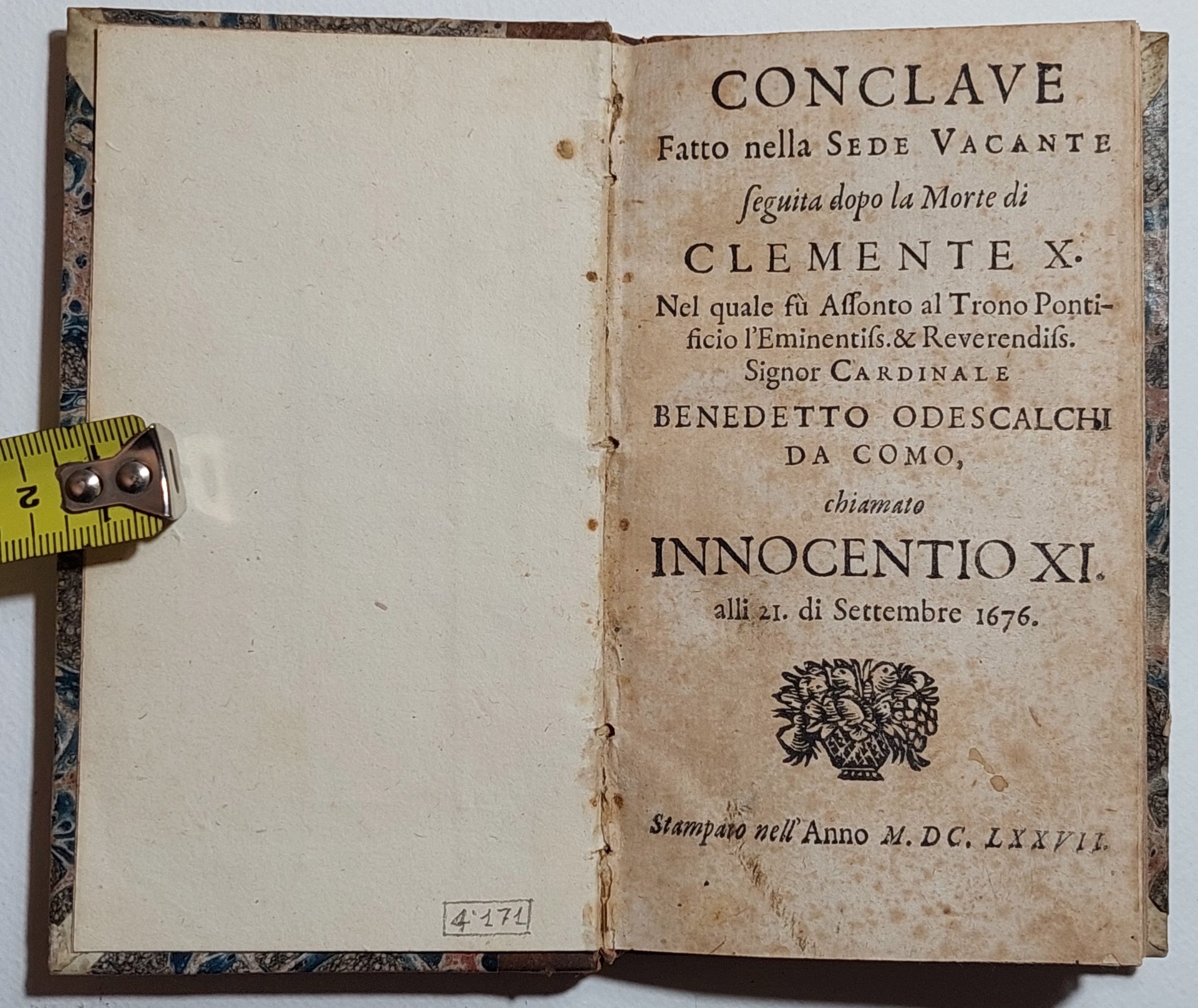 Conclave fatto nella sede vacante seguita dopo la morte di Clemente 10. nel quale fù assonto al trono pontificio l'eminentiss. & reverendiss. signor cardinale Benedetto Odescalchi da Como, chiamato Innocentio 11. alli 21. di settembre 1676 Senza luogo di stampa 1677
