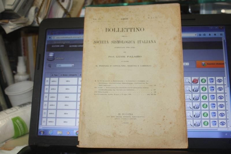 <p>CODICE 2842 BOLLETTINO DELLA SOCIETA' SISMOLOGICA ITALIANA LUIGI PALAZZO N.5 E 6 VOL XI DA PAG 114 A PAG 304 FOXIL E SEGNI DEL TEMPO SULLE COPERTINE scatola 11</p>,