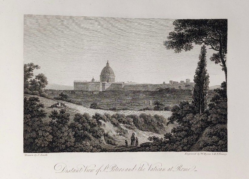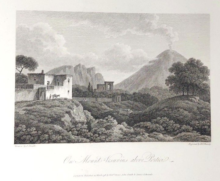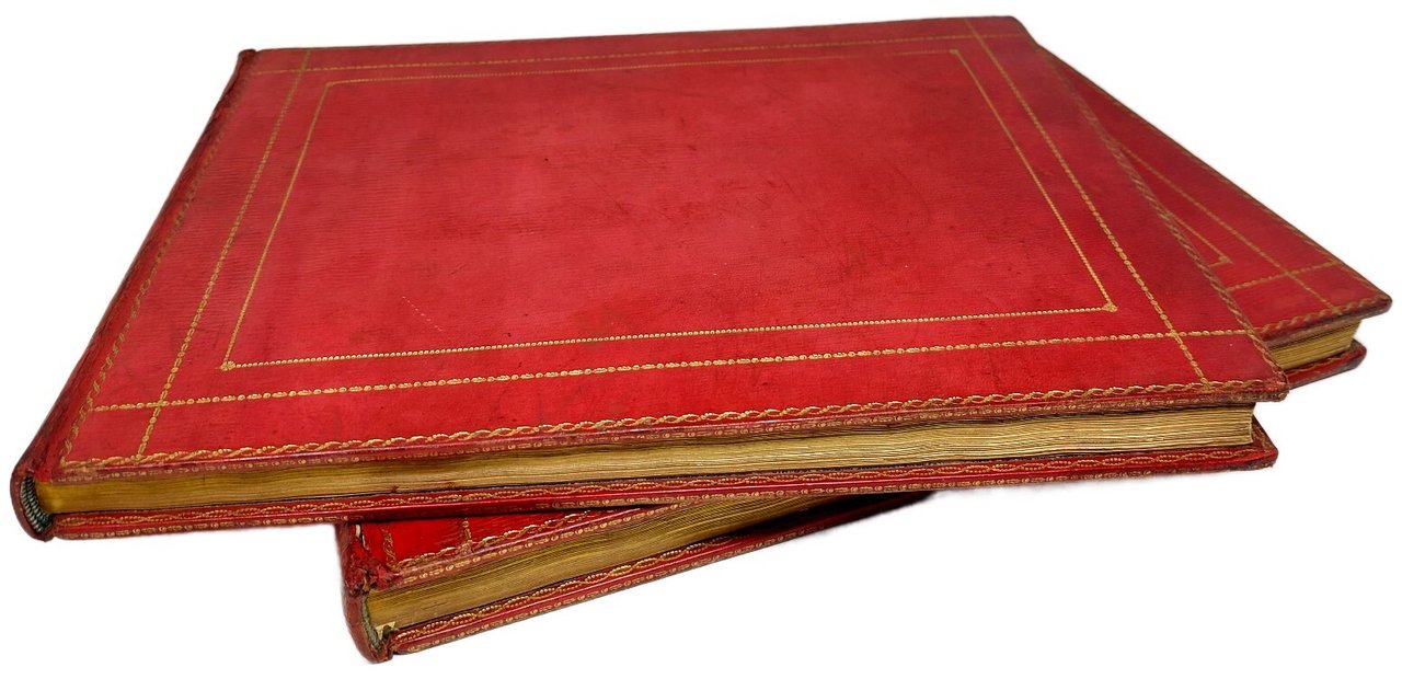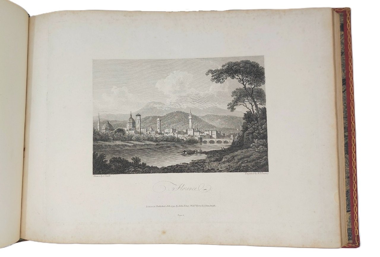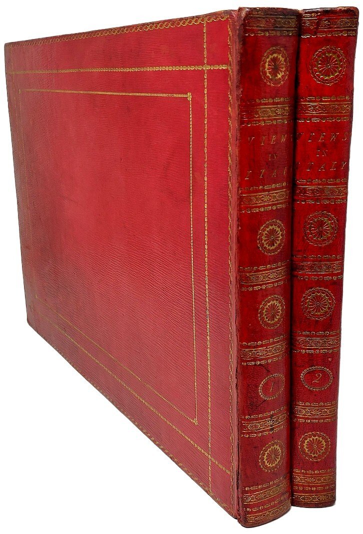 >2 vol. in-4 oblungo (255x353 mm), 2 titoli, dedica incisa alla regina Carlotta, 1 carta d'Italia, 72 tavole incise all'acquaforte da J. Emes, W. Byrne e altri dai disegni di Smith, ognuna accompagnata da 2 fogli di testo a stampa, in francese ed in inglese, con la descrizione località per località del gran tour d'Italia fatto dallo Smith in quegli anni: belle vedute di Bologna, Firenze (varie), Cortona, Perugia, Assisi, Spoleto, Terni, Civita Castellana, Roma (varie), Frascati, Marino, Albano, Nemi, Velletri, Cuma, Pozzuoli, Posillipo, Napoli, Salerno, La Cava, Genova, Volterra, etc. Magnifica legatura in pieno marocchino granata a grana lunga, duplice bordura oro ai piatti, tit. oro e fregi al dorso, tagli dorati (cerniere deboli). Bell'esemplare su carta forte ben conservato nella sua elegante legatura inglese del tempo (lievi e marginali fioriture su alcuni fogli) Cremonini 78.