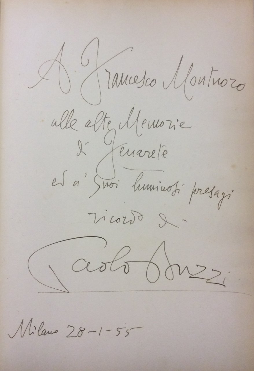 In-8 gr., tela rossa editoriale, pp. 166,(2), con un ritratto fotografico in bianco e nero dell'autore. Antologia edita in occasione delle Onoranze fatte al poeta futurista milanese Paolo Buzzi nel suo ottantennio. In allegato l'invito (di 4 pp.) a partecipare alle onoranze del 26 gennaio, datato 10 gennaio 1955.Il ns. esemplare porta al risguardo una lunga dedica autografa dell'A. a Francesco Montuoro (poeta futurista, autore di "Attimi", 1934). Pagg. ingiallite per la qualità della carta, altrimenti ben conservato.