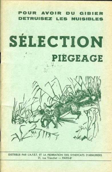 Editions “ Le Lorrain “, Metz, S. d. (vers 1933). Plaquette in/8 broché, couverture illustrée, 63 pages. Plaquette sur la destruction des nuisibles distribuée par la fédération des syndicats d’armuriers. Avec un calendrier du piégeage. Figures en noir dans le texte. Pièges, comment détruire les belettes et les herminettes, piégeage, destruction des fauves, loutre, fouine, martre, putois, assommoirs, les oiseaux de proie et le grand duc, quelques trucs, oeufs au phosphore, le repeuplement des chasses, comment élever des perdreaux à l’état naturel, élevage du faisan.