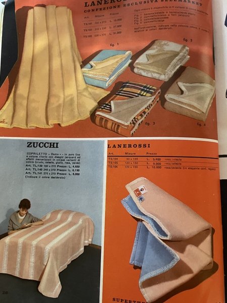 Catalogo Selemarket del 1961. All'interno lista con prezzi di diversi prodotti: porcellane cinesi, strumenti elettrici da cucina, posate e vassoi, accessori da cucina, lampadari Kartell, sedie, bambole Ratti e Vallenzasca, alimenti, tessuti, tappeti, asciugamani e coperte, ombrelli, biancheria per la casa, biancheria intima, coperte lanerossi, profumi, orologi, strumenti musicali ecc. Numerose foto in bianco e nero e colorate. In ottime condizioni. Copertina editoriale in ottime condizioni generali con lievi usure ai margini e dorso. Legatura in ottime condizioni. Pagine in ottime condizioni. In 8. cm. 26x19. Pp. 42+(6).Selemarket catalogue of 1961. Insdie list of prices of different products: chinese porcelains, kitchen electric instruments, Kartells lamps, chairs, dolls Ratti e Vallenzasca, food, tissues, carpets, towels and carpets, umbrellas, house laundry, blankets lanerossi, perfumes, watches, musical instruments ecc. Different black and white and coloured photoes. In very good conditions Editorial cover in very good general conditions slightlly worn in the edges and spine. Binding in very good conditions. Pages in very good conditions. In 8. cm. 26x19. Pp. 42+(6).