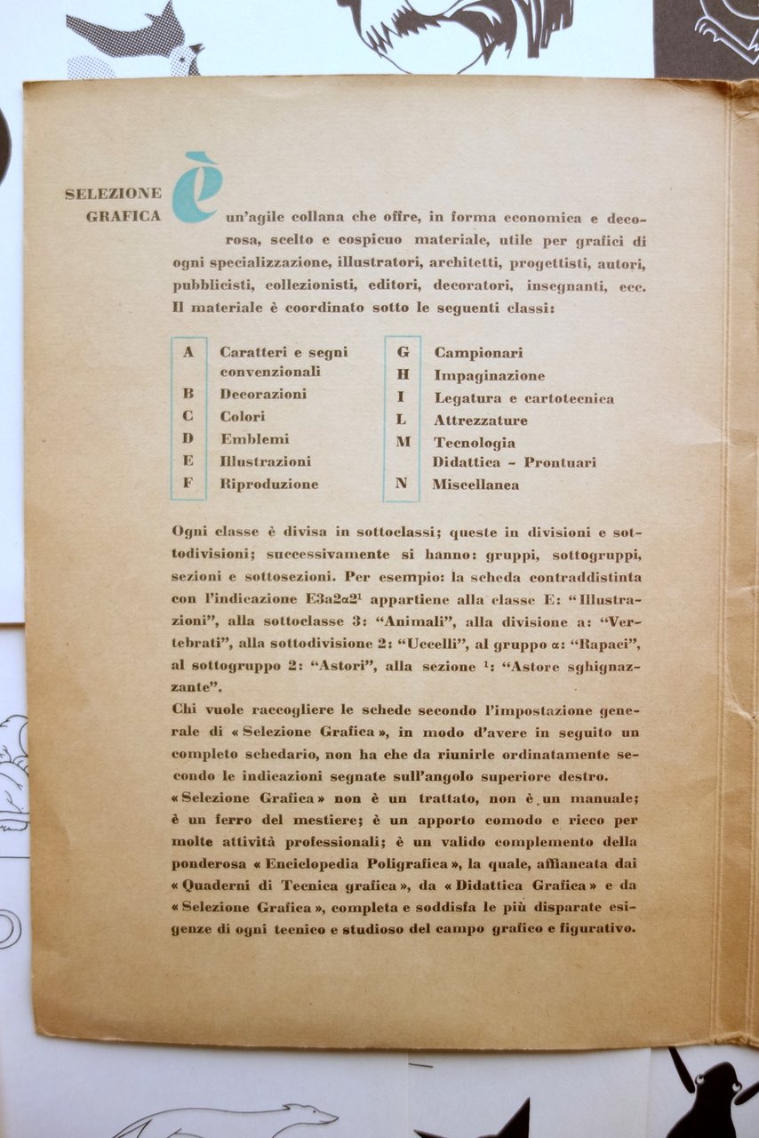 Cartella, Selezione Grafica" coordinamento di Giuseppe Pellittieri e Severino Fabris - dell'Istituto Salesiano Internazionale di Magistero Grafico di Colle D. Bosco (Asti) N.4 - R stilizzazioni di animali Istituto Salesiano Internazionale di Magistero Grafico Don Bosco, Asti 1953; cartella composta da 32 belle tavv. ill. in b/n, numerate progressivamente da 121 a 152; da un bifolio introduttivo (pp. 4 non num.); tavole e bifolio introduttivo sono inseriti entro custodia ed. in cartoncino con bella grafica a colori di copertina. Cartella completa. Condizioni di conservazione Esemplare in buone condizioni con tracce d'uso; cartella leggermente ingiallita con trascurabili accenni di sporco, alla parte inferiore lievi marginali ombre di gore e una leggera macchietta rossa (l'ombra di gora interessa in misura minima anche il margine inf. del bifolio di presentazione ma non le tavole). Tavole tutte complessivamente molto ben conservate (vedi foto). Completa. SETT216.L21478 N "