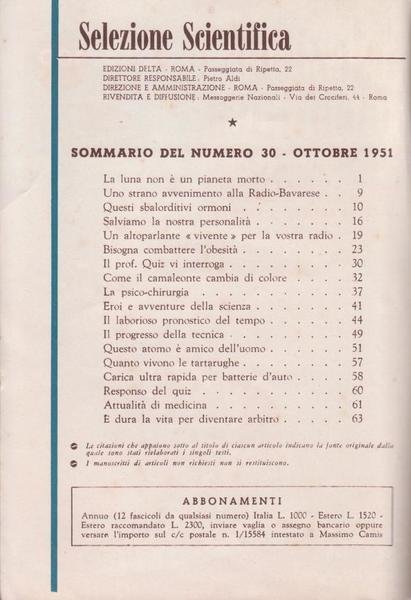 - ZZX DIRETTORE RESPONSABILE: PIETRO ALDI SELEZIONE SCIENTIFICA -, ANNO 3? N. 29 30 31OTTOBRE NOVEMBRE SETTEMBRE 1951 RIVISTA, MENSILE, 1951.