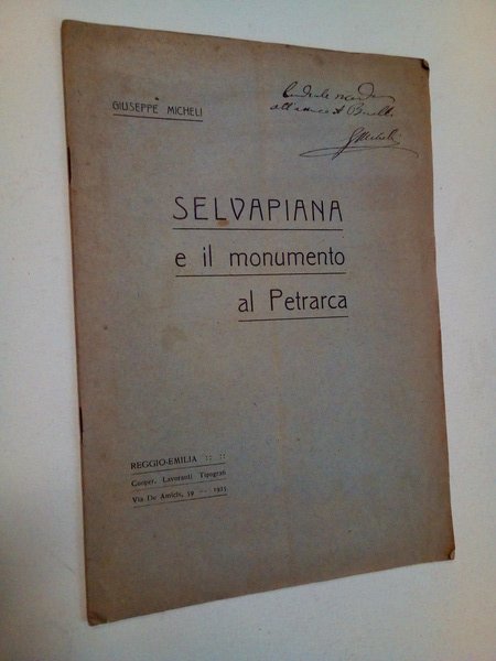 Estratto dalla rivista "La provincia di Reggio" n. 5-6, maggio - giugno 1925.<BR>In 8°; pp. 14 con 3 illustrazioni in nero nel testo; brossura editoriale; spillato.<BR>CONDIZIONI BUONE: l'opuscolo reca traccia di una piegatura longitudinale.<BR>Etichetta di vecchia libreria cessata.<BR>Dedica autografa di Giuseppe Micheli "Cordialmente all'amico A. Boselli" (dei conti Boselli di Parma).