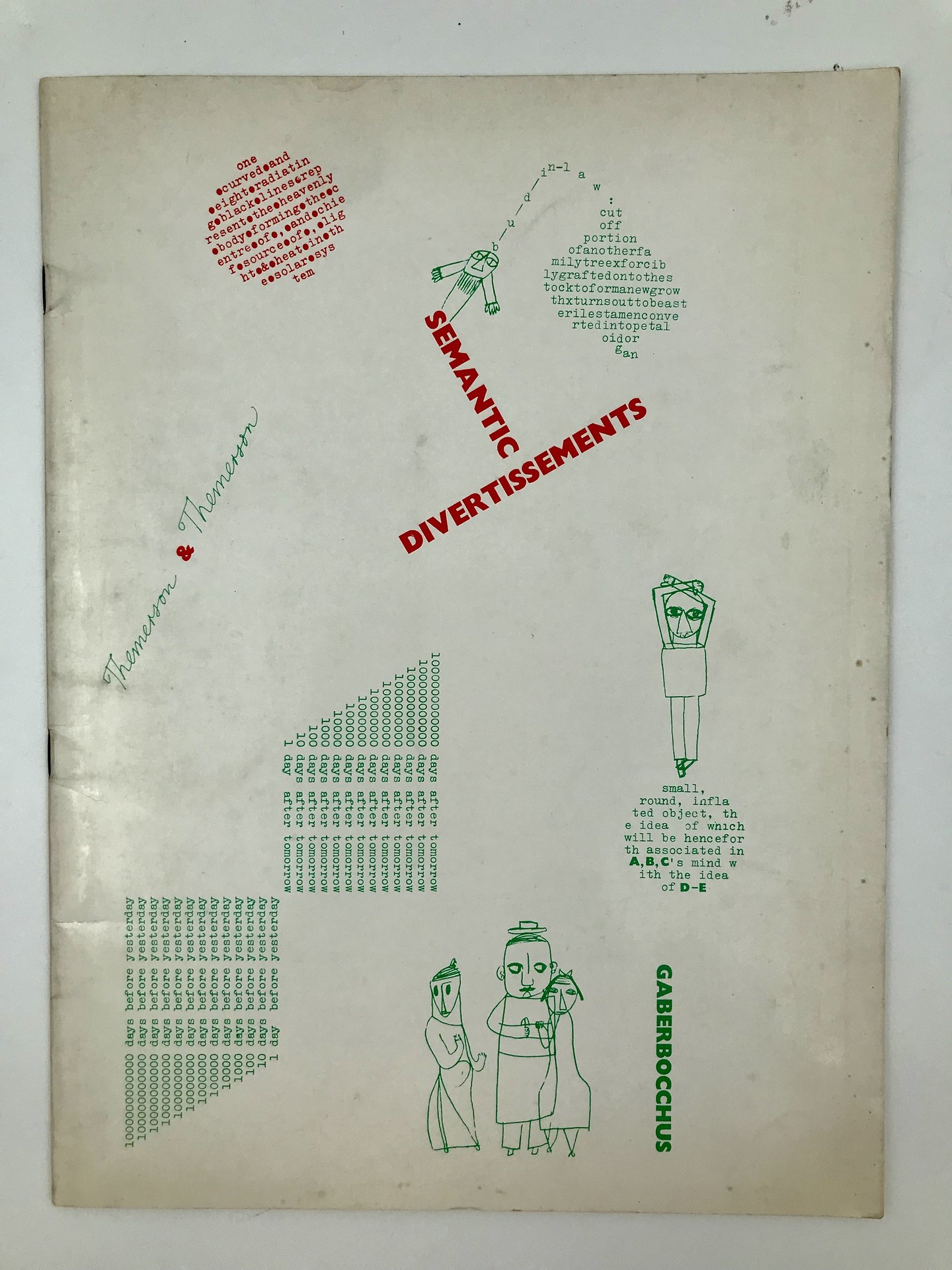Prima edizione di questo libro d’artista che riunisce per la prima volta in volume dieci esperimenti semantico/visivi della coppia di artisti anglo-polacchi Stefan e Franziska Themerson. Il primo (1910–1988) è stato scrittore e filosofo, la moglie Franziska artista visuale, illustratrice, costumista e scenografa teatrale. Cardine della loro ricerca artistica era l’indagine dei rapporti tra testo e immagine: insieme, oltre a dedicarsi al cinema sperimentale, fondarono la casa editrice Gaberbocchus Press, che nel corso dei suoi 31 anni di attività diede alle stampe quasi sessanta titoli, tra cui opere di Alfred Jarry, Kurt Schwitters, Bertrand Russell e Raymond Queneau, con i quali traghettarono oltremanica le sperimentazioni d’avanguardia del continente. Non comune.