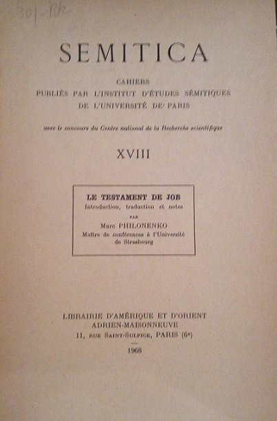 SEMITICA - CAHIERS XVIII - LE TESTAMENT DE JOB: INTRODUCTION, TRADUCTION ET NOTES PAR MARC PHILONENKO, MAITRE DE CONFERENCES A L'UNIVERSITE' DE STRASBOURG