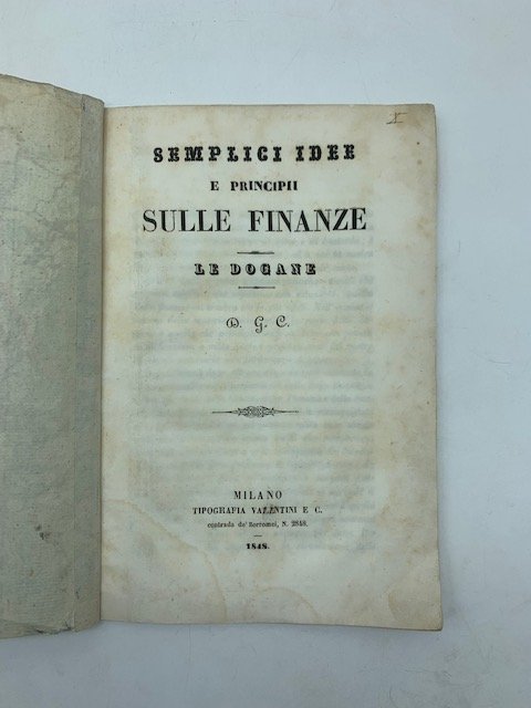 In 8 (cm 14 x 21), pp. 22 + (2 bianche). Brossura coeva con motivo marmorizzato. Opuscolo pubblicato anonimo, con le sole iniziali G. C., sull'istituto della dogana. In calce al testo introduttivo, compare la data "Milano, 13 maggio 1848", con le iniziali dello scrivente. Il testo venne quindi redatto all'indomani del plebiscito delle province del Lombardo-Veneto, liberate dall'occupazione austriaca, svoltosi il 12 maggio, per sancire l'annessione al Regno di Sardegna. Le iniziali G. C. potrebbero - forse - celare il nome di Gabrio Casati, ex Podesta' di Milano, poi presidente che assunse la direzione del Governo provvisorio di Milano come lasciano anche supporre le parole introduttive. Dall'incipit: "Compito che sara' il gran fatto della cacciata dello straniero, ci resta da far sparire ogni piu' lieve traccia di quanto quel regime avea di esoso e di bastardo; e' questa un' opera difficile, astrusa, ed a cui la nostra lena e la nostra pazienza non devono venir meno. Fra le molte e varie quistioni politiche e sociali che sorgono oggidi' e che aspettano una soluzione, quella delle finanze mi sembra tra le piu' vitali. Nell'immenso campo della materia finanziaria, la parte delle dogane e' quella che principalmente richiede una pronta modificazione e sulla quale i provvedimenti del nostro Governo provvisorio non tarderanno a venire. Noi abbiamo detto altrove che da quel momento in cui si stabilirono i preliminari della Lega Doganale tra gli Stati della Chiesa, della Toscana e della Sardegna, si puo' dire che l'Italia abbia riconquistata la sua indipendenza, col fondare sulla base solida degli interessi quella prima unita' che comportano la diversita' dei governi e la molteplicita' dei territorii, unita' che deve produrre il legame federale; da questo giorno l'Italia col riaprire le sorgenti delle sue ricchezse industriali, commerciali ed agricole si mise sulla via d'una prosperita' che superera' quella del Medio Evo e di un'unita' politica sin qui non mai raggiunta".