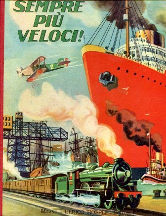 In-8° grande, pp. 40 nn., bella cartonatura editoriale illustrata a colori con figure di mezzi di trasporto (un aeroplano, navi di grandi e piccole dimensioni e un treno in corsa). Dorso in tela rossa. Velina protettiva. 5 tavv. a colori di H. Lambert f.t. e illustrazioni in b.n. dello stesso Lambert n.t. Ottimo stato. Prima edizione, non comune. Racconto per l'infanzia ispirato ai mezzi di locomozione più svariati.