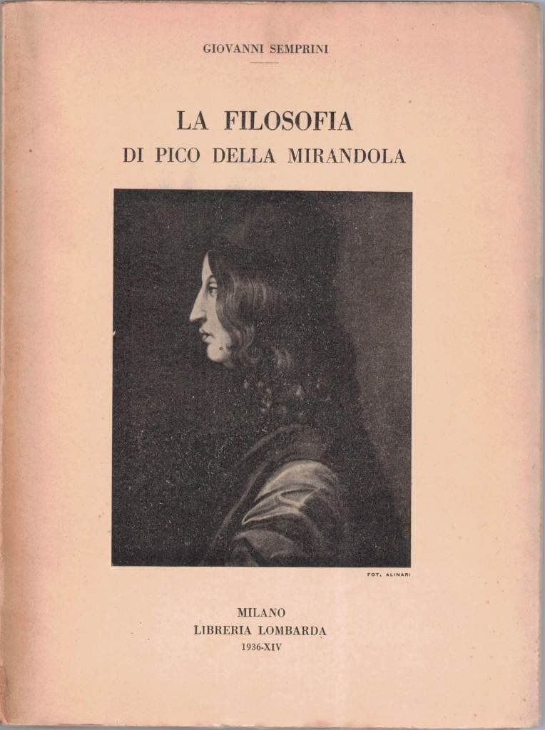 Giovanni Semprini, La filosofia di Pico della Mirandola. In appendice la Lettera a Ermolao Barbaro e l’Orazione sulla dignità dell’uomo, Libreria Lombarda, Milano 1936, pp. 283, cm 22, br. ed. con alette. Indice: Prefazione – La vita – Il pensiero – Le opere – Appendice (Dei filosofi barbari. Lettera di G. Pico a Ermolao Barbaro – Della dignità dell’uomo) – Post fata resurgo – Bibliografia. Dedica manoscritta alla prima carta bianca dall’autore. Minime tracce d’uso alla brossura, lieve brunitura della carta, per il resto perfetto. Intonso.