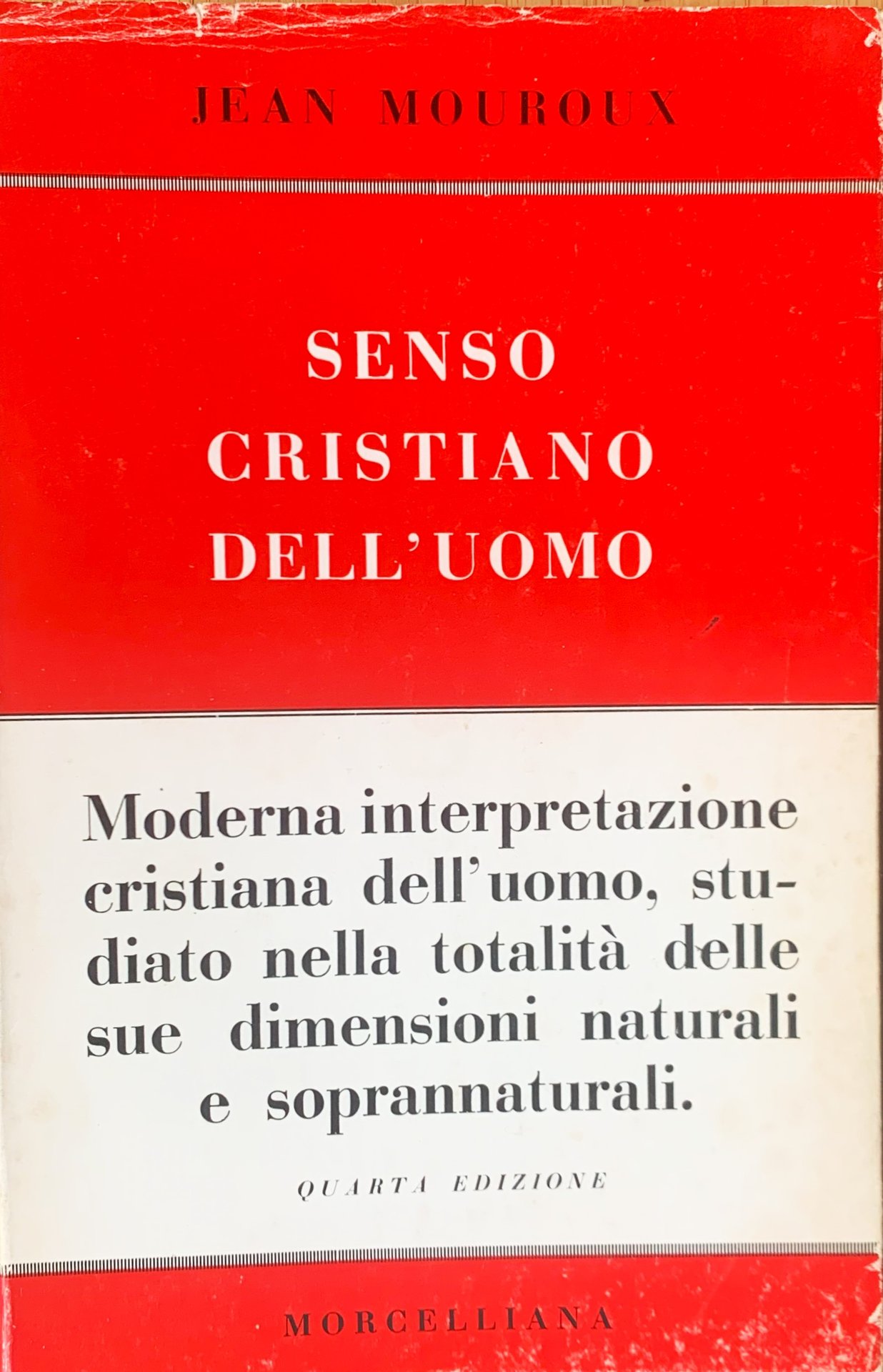 IV ed. italiana (I ed.: Paris, Aubier 1945 - I ed. italiana: Brescia, Morcelliana 1948). Trad.: Domenico Tenderini. Indice-sommario: Prefazione; Jean Mouroux (Digione, 3 ottobre 1943) - Valori temporali (Senso cristiano del temporale - Senso cristiano dell'universo) - Valori della carne (Grandezza del corpo - Miseria del corpo - Redenzione del corpo) - Valori spirituali (La persona umana - La libertà spirituale - La libertà cristiana - L'amore - La carità) - Conclusione (Res Sacra, Homo). In-8, pp. 284+(4), bross.,sovraccoperta con grafica in b/n/rosso. Stato buono (leggero stato d'uso della sovraccoperta ai margini: scoloriture e piccoli strappi - pagine leggermente ingiallite - qualche sottolineatura e qualche segno a margine: tutti a matita con punta medio-grassa e poco calcati)