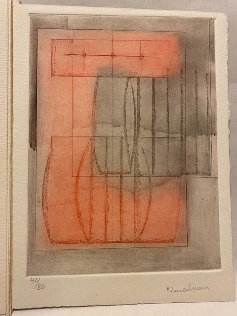 Cofanetto azzurro contenente una cartella con alette e 10 pp. nn. accompagnate da tre incisioni numerate e firmate dall’artista. Opera di 80 copie numerate (42). Sc. F.