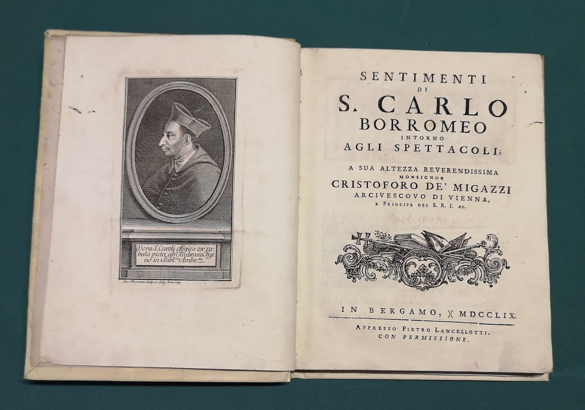 >in-4 picc., pp. (4), XII, 220, leg. coeva p. perg. rigida (abili lievi restauri). Con ritratto di S. Carlo in antiporta dis. ed inc. in rame da Jac. Mercorus; testatina con le armi di Cristoforo De' Migazzi, arcivescovo di Vienni, al quale l'opera è dedicata, fregi ed iniz. silogr. Prima edizione di questo raro studio ''che illustra i provvedimenti presi dall'arcivescovo nel 1565-84 per impedire spettacoli religiosi (come irriverenti) e profani (come scandalosi), persino in collegi". ''Castiglione considera un espediente delatorio il sistema della lettura preventiva degli scenari'' (Encicl. Spettacolo III, 48). Bell'esempl. (piccoli lavori di tarlo nel margine dei primi fogli e, nel testo, ma senza danno sostanziale, da pag. 173 a fine vol.).