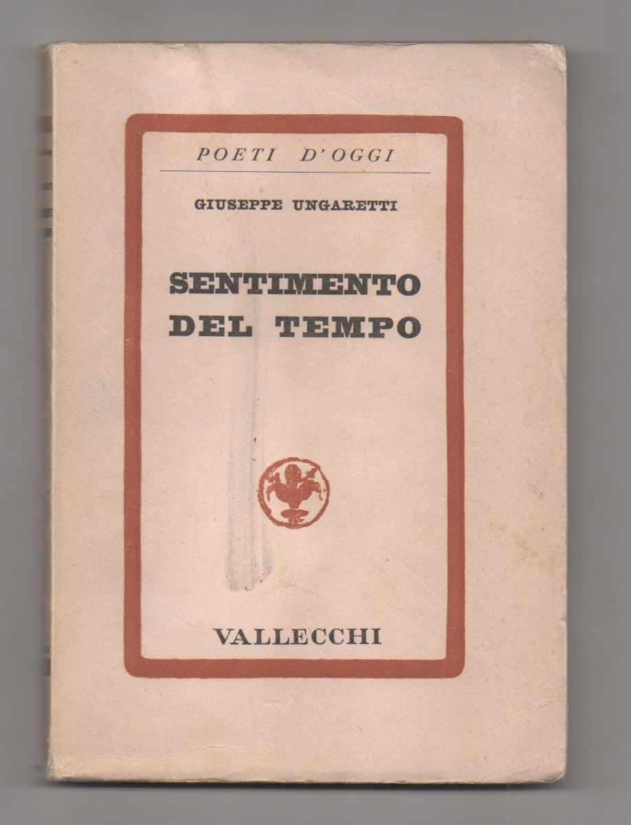 LIBROPrima edizione.Dorso brunito, elegante iscrizione manoscritta d’epoca alla prima carta, che è un po’ allentata; per il resto esemplare più che buono, quasi ottimo, nella variante di tiratura con il titolo stampato in rosso al frontespizio, probabilmente una prima stampa seguita da ristampe non dichiarate con il titolo in nero.«Sentimento del tempo» è da considerarsi la seconda raccolta di Ungaretti, il quale fino a quel momento aveva pubblicato in libro, più volte e con numerose varianti, solo il nucleo noto come «L’Allegria». Rappresenta infatti il secondo capitolo della «Vita di un uomo», nome collettivo sotto il quale il poeta vorrà riunire la sua produzione nel secondo dopoguerra. La maggior parte delle poesie di «Sentimento» — tra cui «La madre» — non erano mai state raccolte in libro, e provengono sparsamente dalle riviste con le quali il poeta collaborava all’epoca: «Commerce», «La Fiera letteraria», «L’Italia letteraria», «Il Fronte», «La Gazzetta del popolo» etc. «Sentimento» uscì in edizione commerciale per Vallecchi mentre contemporaneamente se ne stampava un’edizione per bibliofili in tiratura molto limitata nei «Quaderni di Novissima» di Raffaele Contu. -- L’edizione Vallecchi — e questo è un dato sconosciuto ai repertori specialistici consultati — uscì in due tirature: una con il titolo al frontespizio in rosso, l’altra con il titolo in nero, probabilmente successiva. Ha la prefazione del critico crociano Gargiulo (già prefatore della seconda edizione di «Ossi di seppia»), un testo che accompagnerà la raccolta fino all’edizione «Vita di un uomo» II.