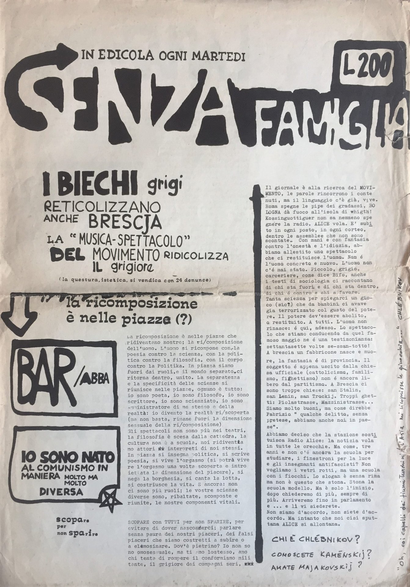 Il nome della testata dissacra la dimensione patetica dell'omonimo romanzo di Malot e sostiene il gioco linguistico del movimento del '77: detournement sulle frasi delle Brigate Rosse ("La nostra rabbia dal nostro cuore al cuore dello stato"), ma anche un articolo contro Dario Fo ("Lo spettacolo esce dai teatri ed entra nelle piazze, Fo esce dallo spettacolo e si infila nella televisione. E' catarro, non liberazione"), e la cronaca delle scuole di Brescia occupate. Esce in supplemento a Stampa Alternativa. Normali pieghe da giornale, piccoli strappi al perimetro delle carte che interessano parzialmente anche il testo, lievi fioriture al margine inferiore della prima pagina.