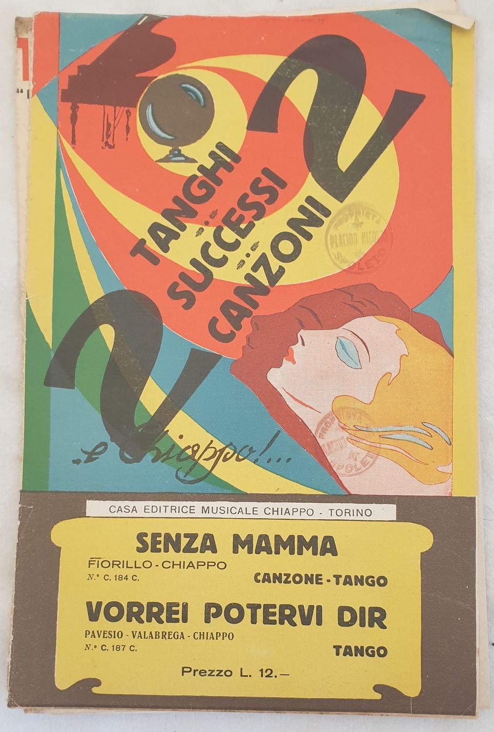 Partitura per orchestra del 1933 delle melodie "Senza mamma" di Fiorillo Chiappo e "Vorrei potervi dir" di Pavesio, Valabrega e Chiappo<BR>Copertina morbida editoriale. GENERE: Tango STRUMENTI: pianoforte, bandoneon, violini; violoncello, sassofono, contrabasso, tromba, batteria ANNO: 1933 DIMENSIONI: In 8. cm 26,5x17 PAGINE: pp. 29 CONDIZIONI: Buone condizioni. Qualche strappo. Piatto posteriore assente. Ex libris in copertinaScore for orchestra of 1933 of the melodies "Senza mamma" by Fiorillo Chiappo and "Vorrei potervi dir" by Pavesio, Valabrega and Chiappo Editorial soft cover. MUSIC: Tango STRUMENTI: piano, bandoneon, violin; violoncello, saxophone, contrabbass, trumpet, drums YEAR: 1933 SIZE: In 8. cm 26,5x17 PAGES: pp. 29 CONDITIONS: Good conditions. Some tears. Back plate lacks. Ex libris in the cover