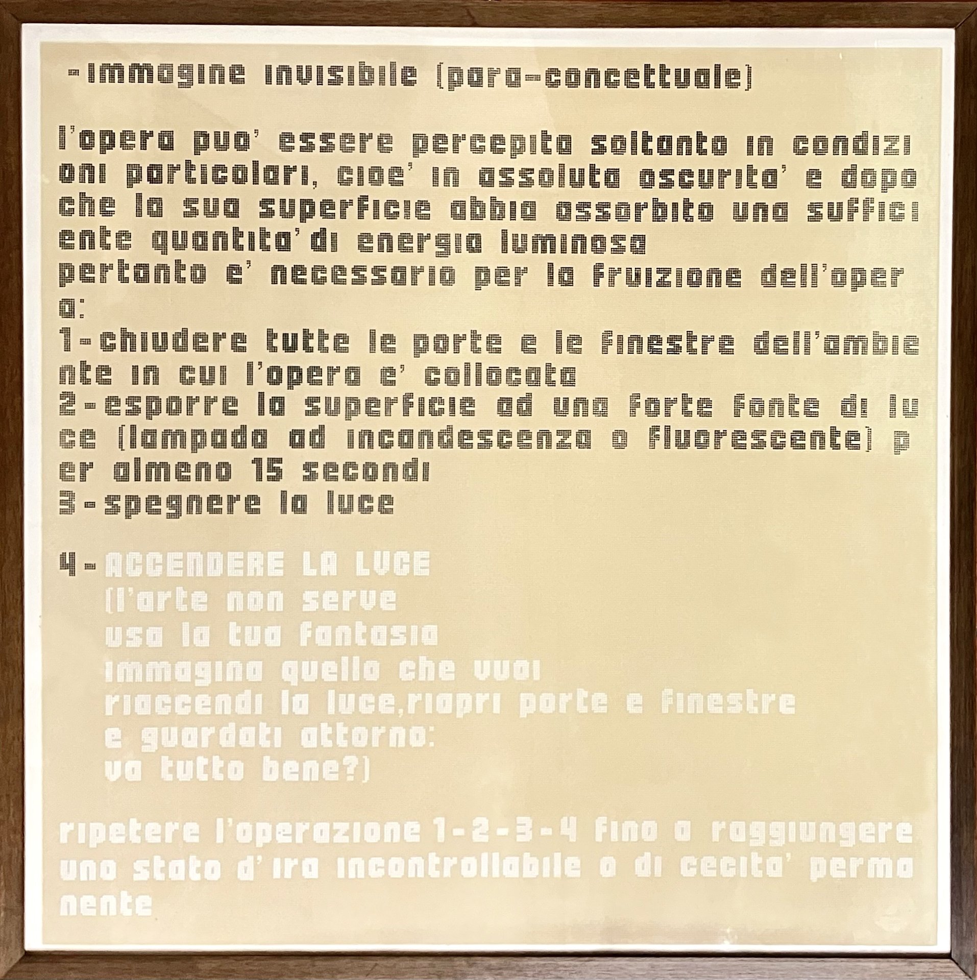Litografia incorniciata in parte fluorescente, esemplare n. IV/XXVI firmato a matita, della tiratura destinata agli autori e allo stampatore. Proveniente dall'ambito delle ricerche cinetiche, già membro del milanese Gruppo T, Davide Boriani (1936) indaga causticamente le proprietà della luce in rapporto alla funzione dell'arte. Il testo offre 4 indicazioni sulle modalità di fruizione dell'opera, ma l'ultimo punto compare e scompare a seconda delle condizioni luminose.