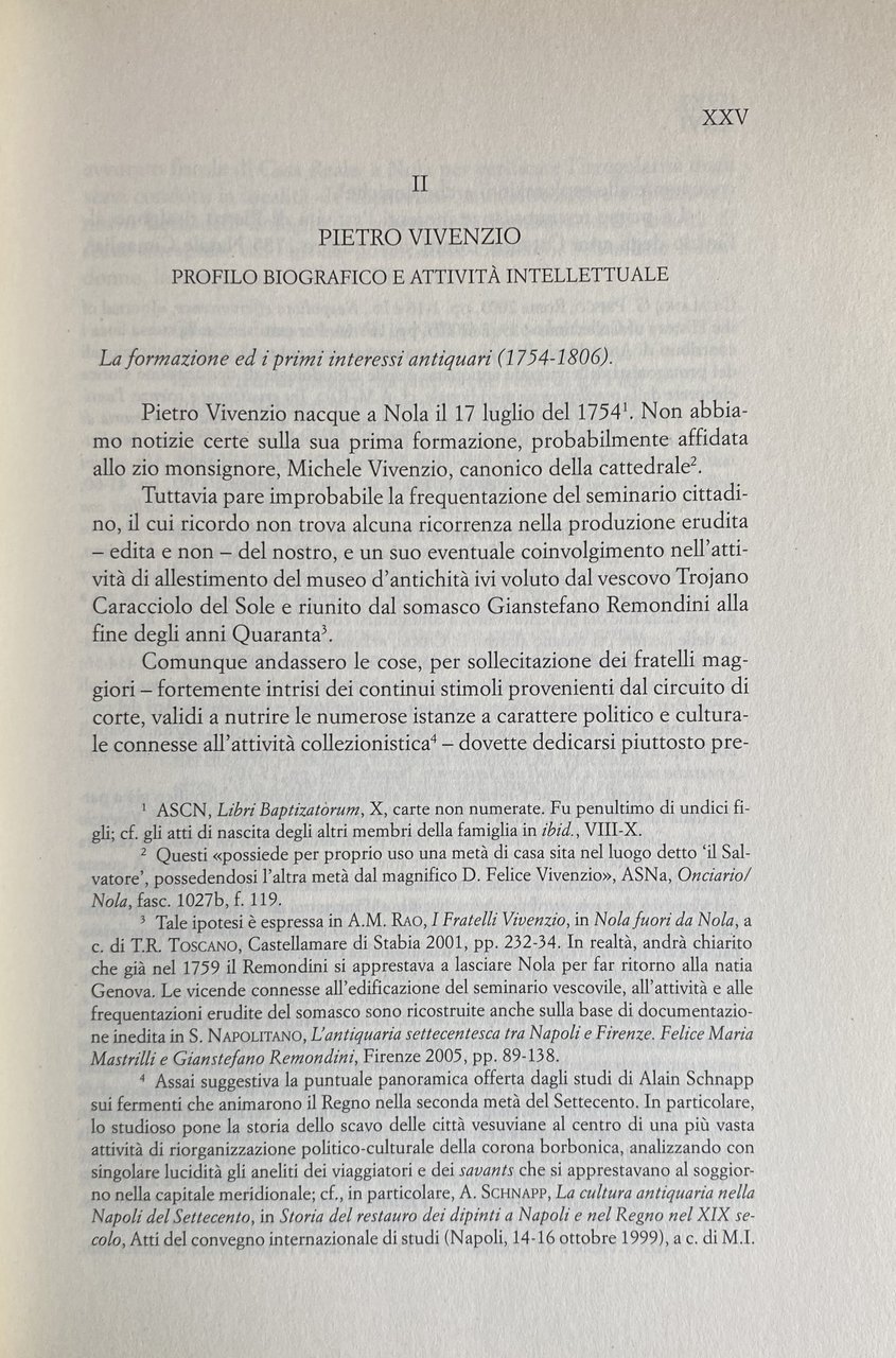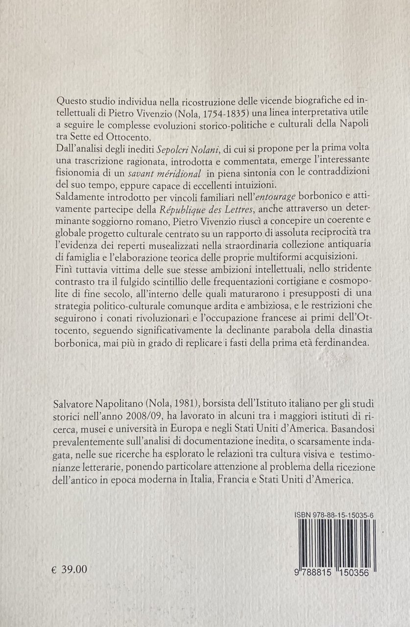 Questo studio individua nella ricostruzione delle vicende biografiche ed intellettuali di Pietro Vivenzio (Nola, 1754-1835) una linea interpretativa utile a seguire le complesse evoluzioni storico-politiche e culturali della Napoli tra Sette ed Ottocento. Dall'analisi degli inediti "Sepolcri Nolani", di cui si propone per la prima volta un'edizione critica introdotta e commentata, emerge l'interessante fisionomia di un savant meridional in piena sintonia con le contraddizioni del suo tempo, eppure capace di eccellenti intuizioni. Saldamente introdotto per vincoli familiari nell'entourage borbonico ed attivamente partecipe della République des Lettres, Vivenzio seppe concepire un coerente e globale progetto culturale centrato su un rapporto di assoluta reciprocità tra l'evidenza dei reperti musealizzati nella straordinaria collezione antiquaria di famiglia e l'elaborazione teorica delle proprie multiformi acquisizioni. Finì tuttavia vittima delle sue stesse ambizioni intellettuali, nello stridente contrasto tra il fulgido scintillio delle frequentazioni cortigiane e cosmopolite di fine secolo, all'interno delle quali maturarono i presupposti di una strategia politico-culturale comunque ardita ed ambiziosa, e le restrizioni che seguirono i conati rivoluzionari e l'occupazione francese ai primi dell'Ottocento, assecondare significativamente la declinante parabola della dinastia borbonica, mai più in grado di replicare i fasti della prima età ferdinandea.