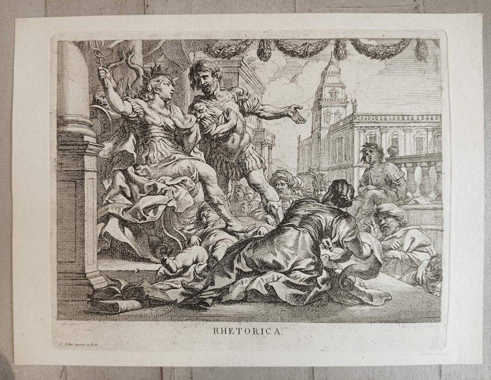 >Incisione originale in rame su carta forte (mm 255 x 320), con margini; in basso centrale il titolo "Rhetorica", in basso a sinistra "C. Schut invent. et fecit". Bella scena animata che rappresenta l'allegoria della seconda arte liberale, ad opera di Schut, artista Fiammingo, pittore e incisore (Anversa 1597 - 1655). L'incisione fa parte di una raccolta assai rara di 8, titolate nel margine inferiore: Musica, Geometria, Rhetorica, Gramatica, Arithmetica, Astrologia, Dialectica. Opera perfettamente conservata.