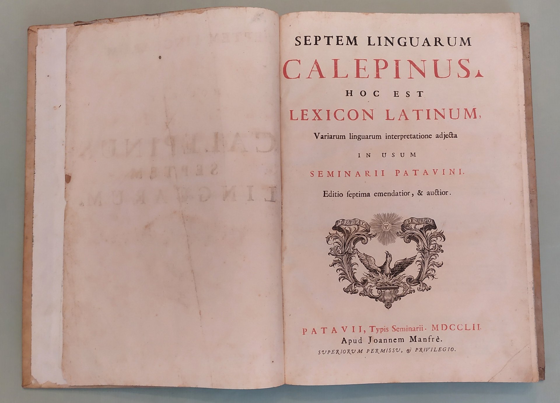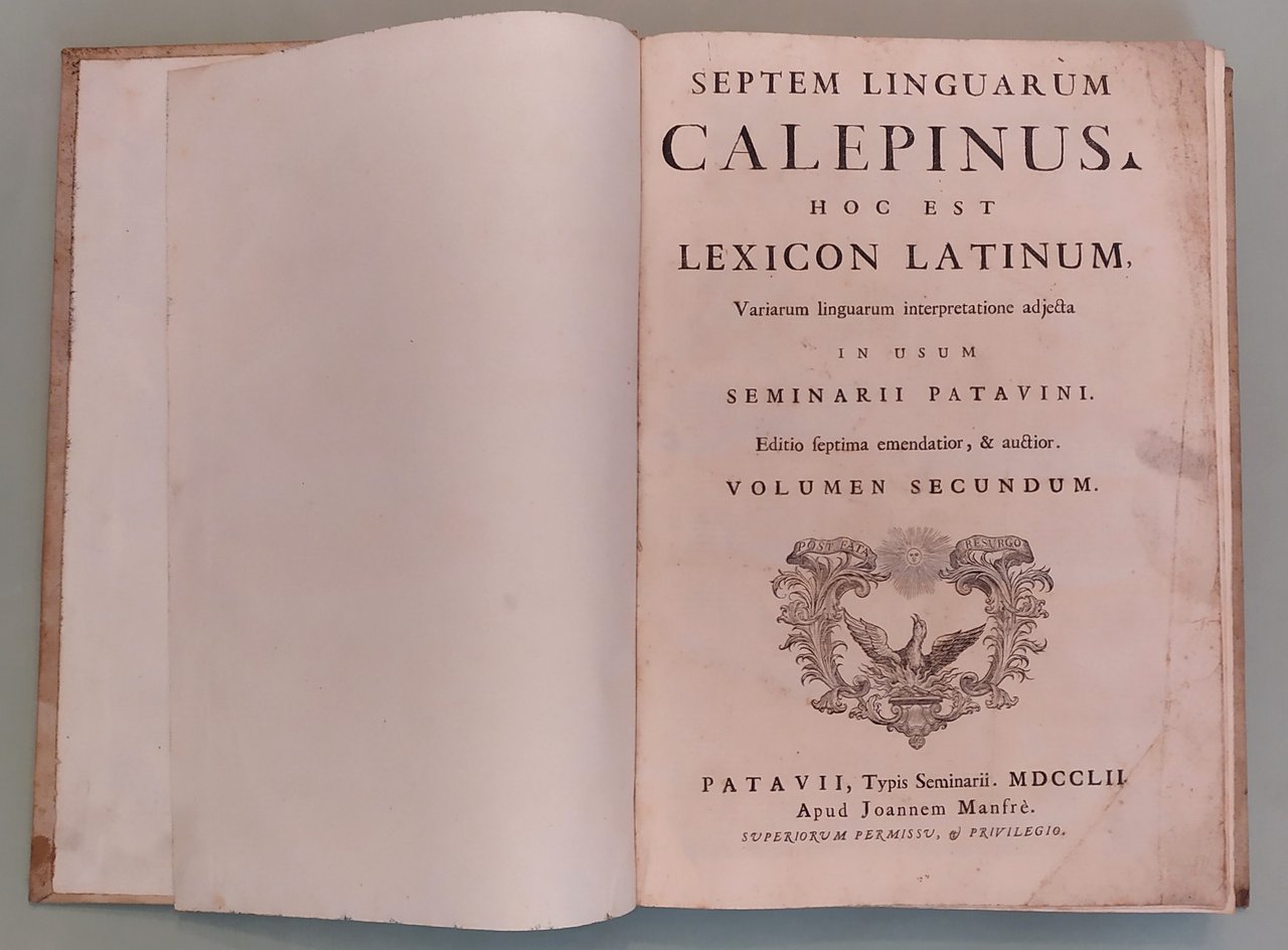 Septem linguarum Calepinus. Hoc est lexicon latinum, variarum linguarum interpretatione adjecta in usum Seminarii patavini. Editio septima emendatior, & auctior.
