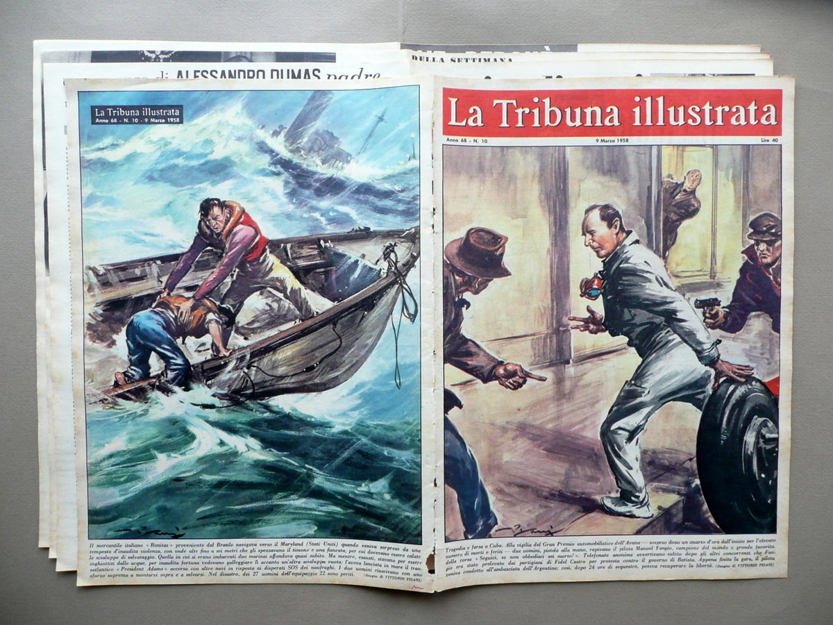 Rivista, Tragedia e farsa a Cuba. Alla vigilia del Gran Premio automobilistico dell'Avana - sospeso dopo un quarto d'ora dall'inizio per l'elevato numero di morti e feriti - due uomini, pistola alla mano, rapivano il pilota Manuel Fangio, campione del mondo e grande favorito. [.]" Copertina a colori de "La Tribuna Illustrata" Anno 68 - Numero 10 9 Marzo 1958 Roma 1958, cm 38,5x27,5, pp. 32 con numerose ill. in b/n nel t. (qualcuna a col); copertina e ultima pagina entrambe con belle ill. a colori (vedi foto); esemplare a fogli sciolti per mancanza delle cuciture. Numero completo. Condizioni di conservazione Esemplare ben conservato con tracce d'uso, a fogli sciolti per mancanza delle cuciture; qualche minima brunitura; dorso con alcuni piccoli strappetti e tracce di precedente inserimento dell'esemplare entro volume. Interni buoni. Numero completo. SC03.D12265 N F "