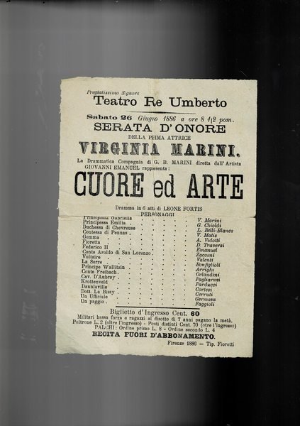 Serata d'onore della prima attrice Viginia Marini. Volantino pubblicitario della rappresentazione della commedia Cuore ed arte dramma in 6 atti di Leone Fortis, al teatro Re Umberto sabato 26 Giugno 1886. Contieme i nomi dei personaggi e degli interpreti.