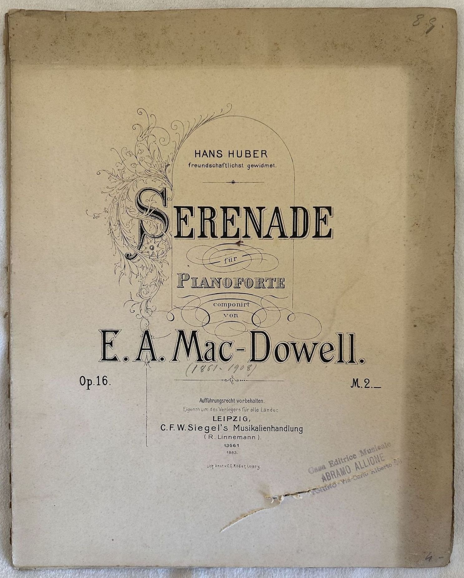 Edizione del 1883 della melodia per pianoforte "Serenade" dall'opera 16 del compositore americano Edward MacDowell (1860-1908). In discrete condizioni. Copertina editoriale in buone condizioni con lievi usure marginali. Strappo orizzontale. Legatura editorialmente assente. Pagine in discrete condizioni con rare fioriture e lievi gore d'umidità. In 4. cm. 34x27,5. Pp. 7.Edition of 1883 of the melody for piano "Serenade" of the opera 16 by the american composer Edward MacDowell (1860-1908). In fair conditions. Editorial cover in good conditions lightly worn in the extremities. Horizontal tear. Binding almost lacks. Pages in fair conditions with occasional foxing and light dump stains. In 4. cm. 34x27,5. Pp. 7.