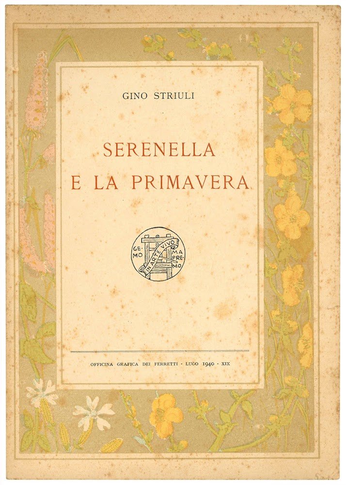Mm. 139x168. Pp. 45, [3]. Carta leggermente ed uniformemente brunita. Testo stampato su carta illustrata. Brossura editoriale con titolo entro cornice illustrata a colori. Lievi fioriture alle copertine. Edizione pubblicata in 120 esemplari numerati. La copia offerta è la n. 57. Invio autografo dell'autore al margine superiore del recto della seconda carta: "All'amico carissimo Riccardo Chiarelli con affettuosa cordialità. Lugo, 2 Dic. 1940".