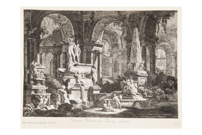 >Folio (375x545 mm). Titolo inciso su doppia pagina, dedica incisa, 12 tavole incise a doppia pagina da Pietro Gaspari. Mezza pergamena del XIX secolo. Bellissimo esemplare con nitida inchiostratura (il margine bianco inferiore delle prime 4 carte è più corto). Prima edizione estremamente rara di questa collezione di scenari architettonici immaginari, commissionata dal principe Charles Theodore elettore di Baviera e ispirata ai Capricci di Piranesi. Le invenzioni mescolano abilmente antiche rovine ed edifici barocchi con elementi egizi e gotici, che il pittore e incisore veneziano Pietro Gaspari (1720-1785) aveva visti durante i suoi viaggi in Francia, Italia e Germania. Kat. 4183; Christie’s, VershbowSale, Part 3: The Baroque and Rococo Periods, New York, 2013, lot 521.